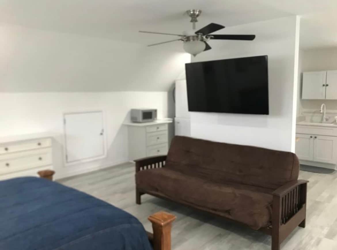 Welcome to our gorgeous basement studio! Recently updated decor including sultry bedroom with the comfiest king bed + crisp cotton linens. Desk/workspace. Private bathroom with shower. Spacious den with comfy couch & tv. Extra linens, pillows, & blankets. Kitchenette including fridge, microwave, toaster oven, & coffee essentials. Washer/dryer available for extra fee. Private entrance! Access to shared backyard patio & pool (pool is open Apr- Oct). *Please review all rules before booking