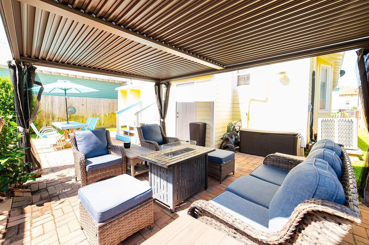 • Hot tub, outdoor putting green & game room with ping pong, foosball & darts! • Amazing 2nd floor wraparound deck space with 270° views • Gorgeous outdoor tiki bar, fire pit, hammocks & more! This home is centrally located in Crystal Beach with shops and restaurants just a 2 min drive away! Or, you can stay home & sip coffee & beach views on the back porch The trendy, fully stocked kitchen has a full coffee bar & is ready for you to enjoy a meal or drinks with friends & family