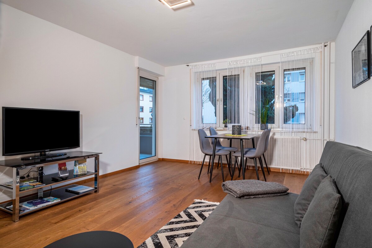Appartament ta' studio eleganti fil-qalba ta' Friedrichshafen: Ideali għall-vaganzi u għan-negozju. Tinsab fiċ-ċentru: ftit minuti mixi biss sa Lake Constance, Stazzjon Ċentrali, Rolls-Royce Power Systems/MTU u Porsche Zentrum. Kċina mgħammra b' mod eleganti, mgħammra b' kollox, arja kkundizzjonata u ħafna dawl tax-xemx. Veduta tal-Alpi f' temp tajjeb. Aċċess awtomatiku 24 siegħa kuljum, spazju għall-parkeġġ inkluż. Ristoranti, xiri u trasport pubbliku eżatt barra l-bieb. L-irtirar tiegħek b' kumdità tajba f' nofs il-belt.