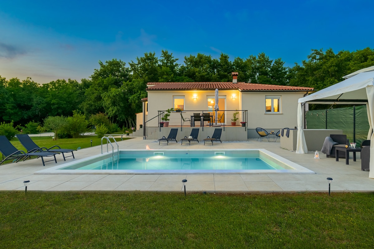Villa "Qube n'Qube " b' pixxina msaħħna (iktar minn 30.- kuljum), 4 ikmamar tas-sodda ensuite u żona tas-salott miftuħa eleganti. Jinsab f' Loborika paċifika, biss 6 km 'il bogħod minn Pula u 8 km' il bogħod mill-baħar. Gawdi ġnien privat magħluq b' terrazzin, BBQ u park tal-logħob għat-tfal. Kċina mgħammra b' kollox, A/C madwarha u smart TVs f' kull kamra. Ideali għal vaganza rilassanti ġewwa Istrijana!
