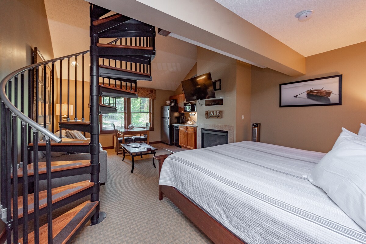Suite tal-istudio king u queen tat-tielet sular b' loft, veduti standard u fireplace tal-gass. (L-aċċess għal-lift huwa inkluż) Il-kumditajiet tal-lukandi jinkludu marina fuq il-post (staġjonali), ikliet fuq il-post, kamra tal-logħob, kamra tal-fitness, sawna, WIFI bla ħlas u loft tal-qari! Staqsi lill-front desk tagħna qabel il-wasla tiegħek dwar iż-żieda ta' pakketti ta' romanzi/massaġġi jew dwar il-kiri ta' kmamar tal-konferenzi għall-vjaġġ tax-xogħol tiegħek!