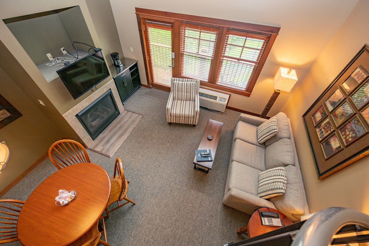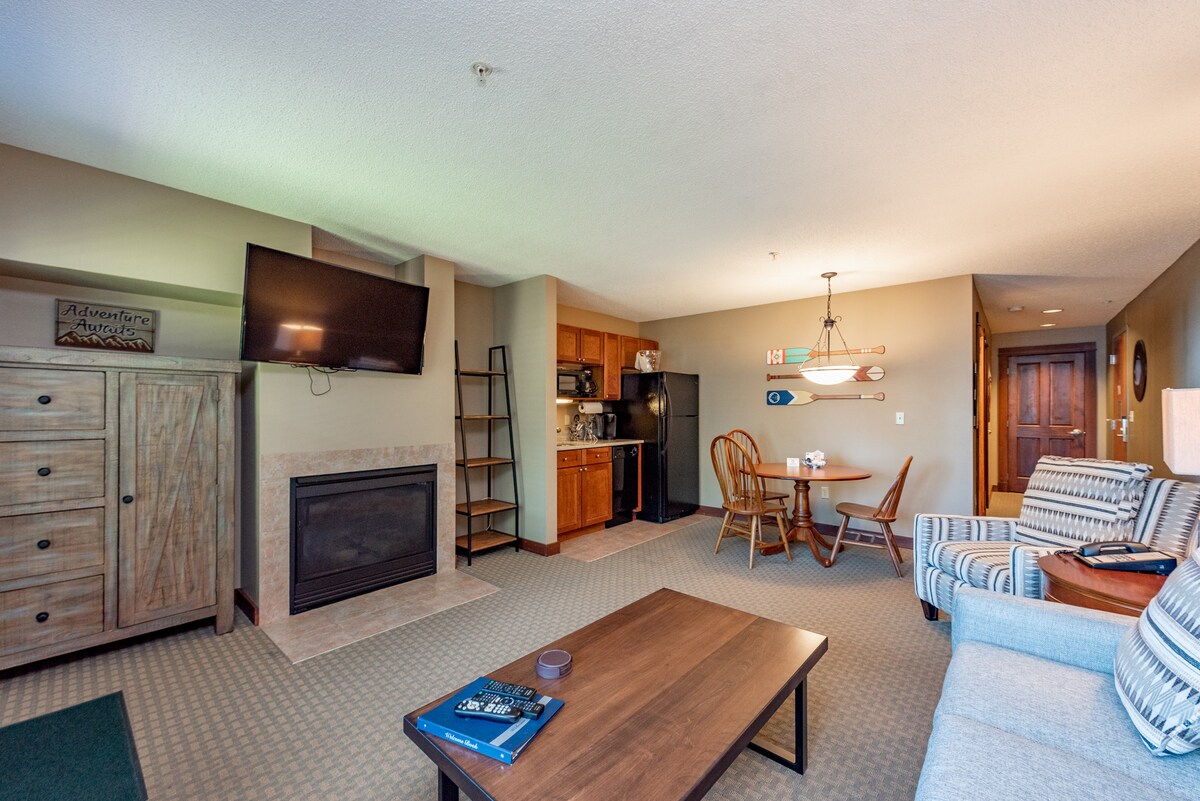 Suite b' kamra tas-sodda waħda (unità tat-tarf) tal-ewwel sular b' veduti standard u fireplace tal-gass. (L-aċċess għal-lift huwa inkluż) Il-kumditajiet tal-lukandi jinkludu marina fuq il-post (staġjonali), ikliet fuq il-post, kamra tal-logħob, kamra tal-fitness, sawna, WIFI bla ħlas u loft tal-qari! Staqsi lill-front desk tagħna qabel il-wasla tiegħek dwar iż-żieda ta' pakketti ta' romanzi/massaġġi jew dwar il-kiri ta' kmamar tal-konferenzi għall-vjaġġ tax-xogħol tiegħek!