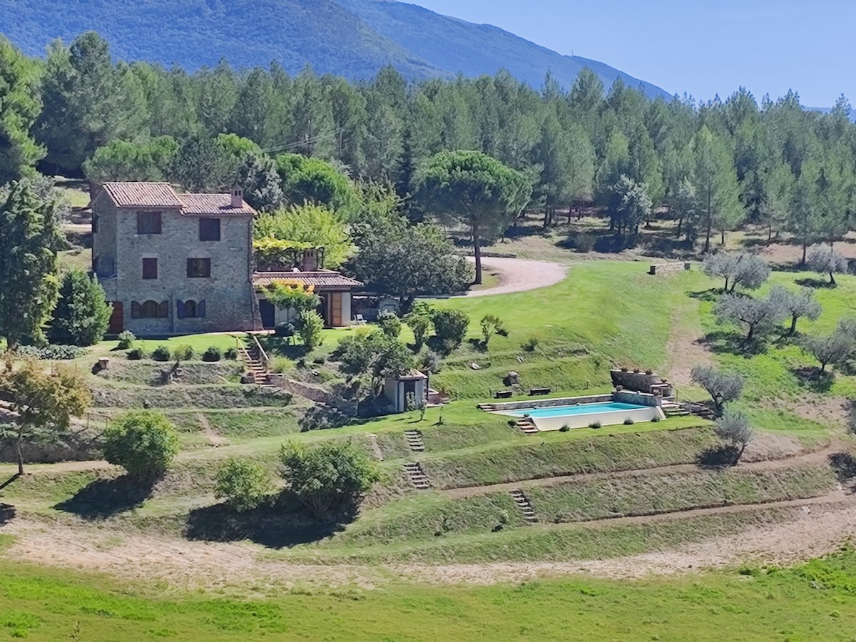 Proprjetà ta' 10 ettari fuq għolja, esklussiva u mill-isbaħ, inżul ix-xemx mill-isbaħ; pixxina kbira mdawra bil-lavanda u l-klin, miftuħa sena kollha. Arja kkundizzjonata ġdida, internet Starlink. 2 sulari privati ħafna, 4 ikmamar tas-sodda, 4 ikmamar tal-banju, jacuzzibathtub, smartTV ta' 55 pulzier, kċina mgħammra sew, veranda u pergola għall-ikel alfresco, barbecue ta' Weber, forn tal-pizza, imsaġar taż-żebbuġ, fireplace; 20 minuta sa Orvieto,Todi,Amelia; 10 minuti sewqan sa stazzjon tal-ferrovija sa Ruma/Firenze, 5 minuti sewqan sa ħwienet tal-belt. Raġunijiet/persuna li tieħu ħsieb il-pixxina