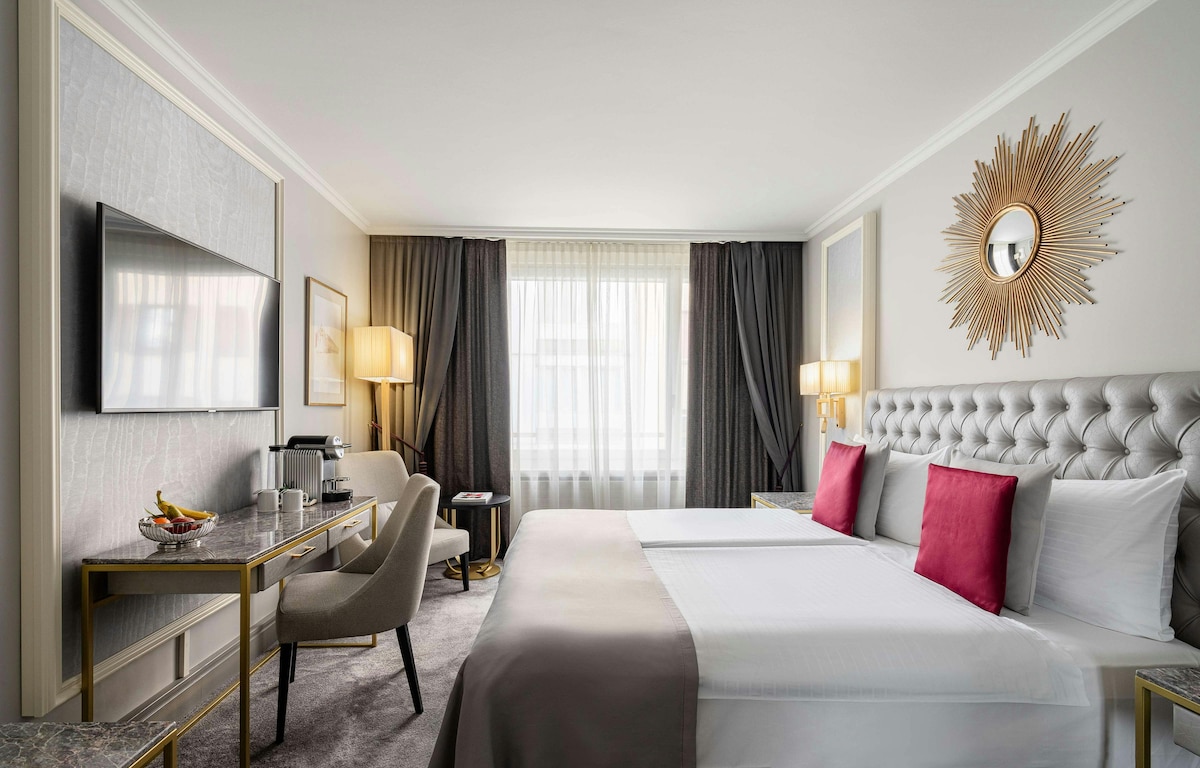Ideal for extended stays, our Superior Studios at the 4-star Royal Hotel offer a bright, refined 20-25m² space with everything you need. Each studio features a kitchenette with a Nespresso machine, an office area, a plush double or twin beds, and a full bathroom. Enjoy amenities like free Wi-Fi and access to laundry facilities. With daily light maintenance and full cleaning weekly, you’ll feel right at home in the heart of Geneva.