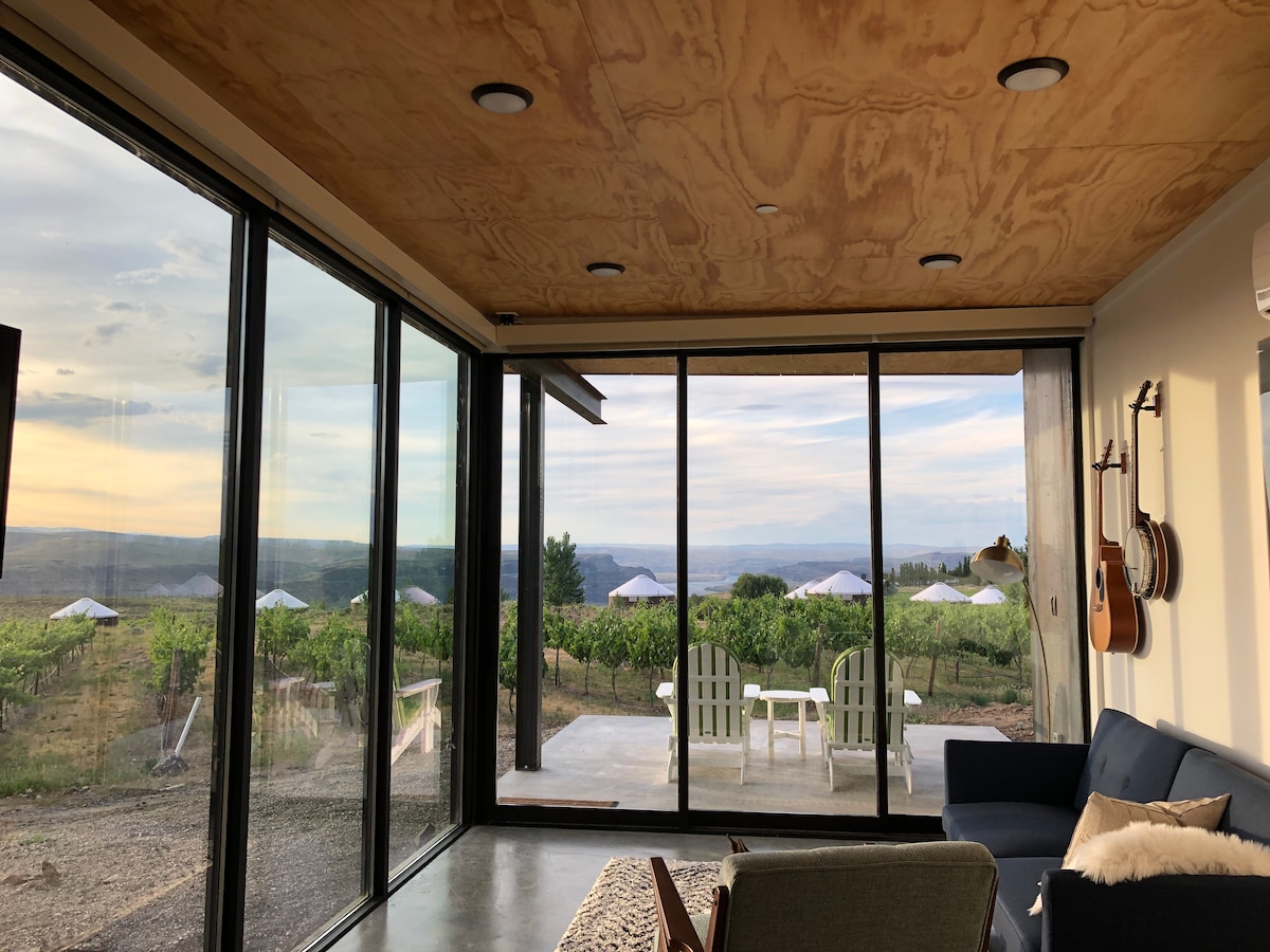 Il-VIP Lounge hija dar iddisinjata minn Olson Kundig. Taraġ mill-Amfiteatru Gorge, jagħti fuq l-għelieqi tad-dwieli tal-Inbid Cave B Estate u x-Xmara Columbia. Id-dar b' kamra tas-sodda u kamra tal-banju waħda tagħna għandha terrazzin privat u kċina mtejba. Hija perspettiva komda u moderna-industrijali li taqbel mal-pajsaġġ. Mixja lejn kunċerti, dewqan tal-inbid, ikla ta' filgħaxija jew bookings ta' spa. Mixja bil-Franċiż Coulee, rota tal-Lagi Antiki, gawdi l-yoga fuq it-terrazzin, jew sempliċiment irrilassa u ħu veduta