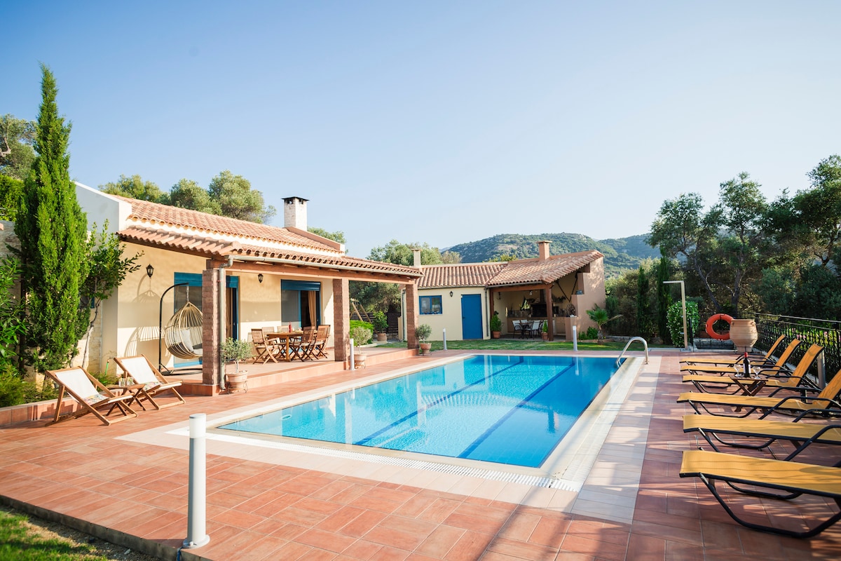 Il-villa tal-ġebel Kainourgia, b' pixxina bit-temperatura, tinsab fir-raħal sabiħ ta' Gerani, toffri: - Pixxina mdawwra bit-temmrenated - Parkeġġ bla ħlas - 4 kmamar tas-sodda - 3 kmamar tal-banju - Bbq - Gallariji u terrazzin mill-aqwa - Kċina konvenjenti u kbira - Disinn uniku Distanza: - L-eqreb ristorant 🥗 - 90 m 'il bogħod - L-eqreb Supermarket 🛒 - 40 metru 'l bogħod - L-eqreb bajja ⛱️ - kilometru 'l bogħod - L-eqreb ajruport ✈️ - 58 km 'il bogħod - L-eqreb belt - 6 km Karozza suġġerita!