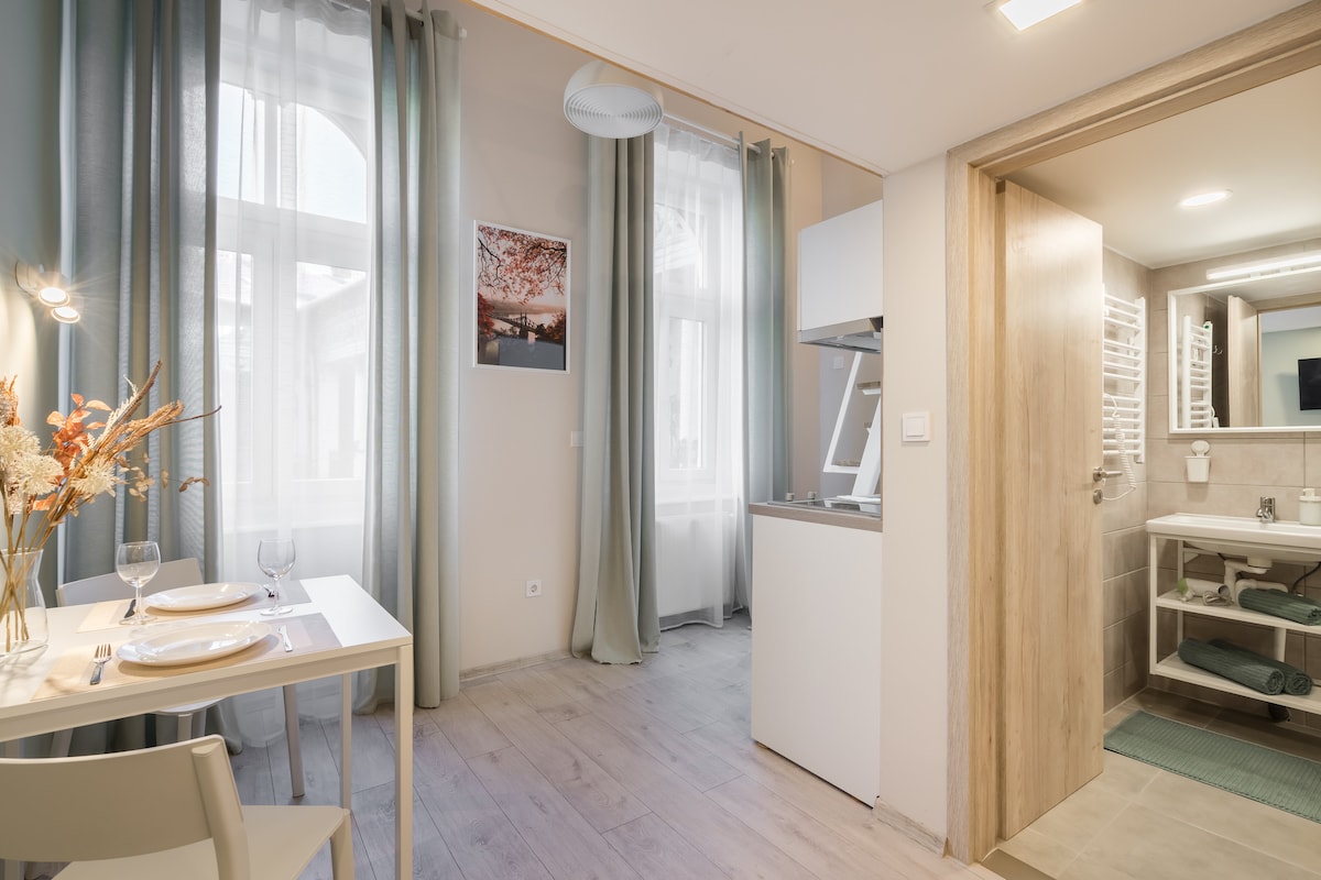 Meta wasal biex jinħoloq dan l-appartament ġdid u bl-arja kkundizzjonata fiċ-ċentru tal-belt ta 'Budapest, l-għan tagħna kien li noffru sthg eċċezzjonali lill-klijenti futuri tagħna. Din kamra tas-sodda waħda, kamra tas-salott waħda ċatta deluxe hija ideali għal koppji jew familji żgħar sa 4 persuni. Il-bini antik jinsab 100 metru 'l bogħod mid-Danubju fid-distrett ċentrali storiku, minn fejn se jkollok aċċess faċli għaċ-ċentru u għall-postijiet ewlenin tal-belt, bħall-Parlament jew il-Bażilika ta' San Stiefnu.