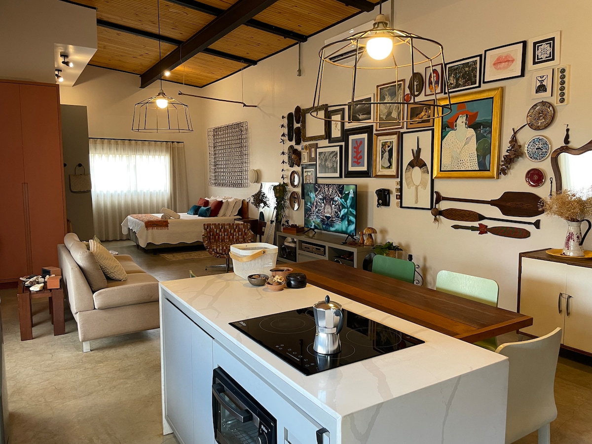 São 45 m² de apartamento completo, só para vocês! Em estilo Studio com conceito aberto, design moderno e acolhedor, nossa acomodação une conforto, praticidade e localização privilegiada no alto do Setor Bueno ideal para LAZER, SAÚDE ou TRABALHO. Oferecemos CAMA QUEEN SIZE e uma cama auxiliar de solteiro. Enxoval premium, decoração pensada nos detalhes e ambiente climatizado garantem uma estadia inesquecível. Wi-Fi, Smart TV e cozinha equipada completam o pacote para que você se sinta em casa😁