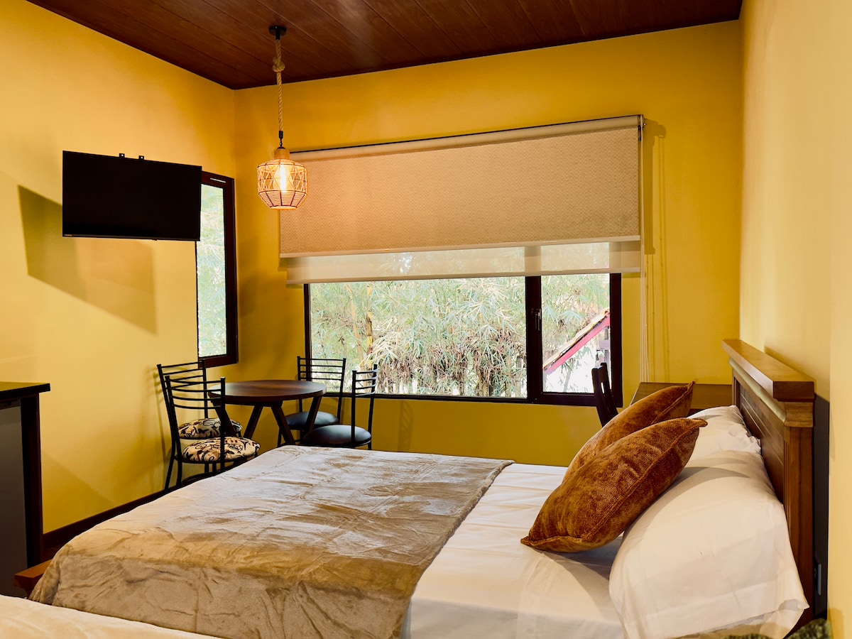 Mini suite con cocina, comedor y espacio para trabajar, ubicada en el tercer piso de la casa principal, con entrada independiente, estacionamiento gratuito, vista panorámica, lejos del ruido de la ciudad, excelente espacio para disfrutar de la naturaleza, si el clima lo permite se puede ver el volcán Reventador. La habitación cuenta con WiFi, agua caliente, baño independiente dentro de la habitación. Se puede usar el espacio para BBQ previa coordinación.