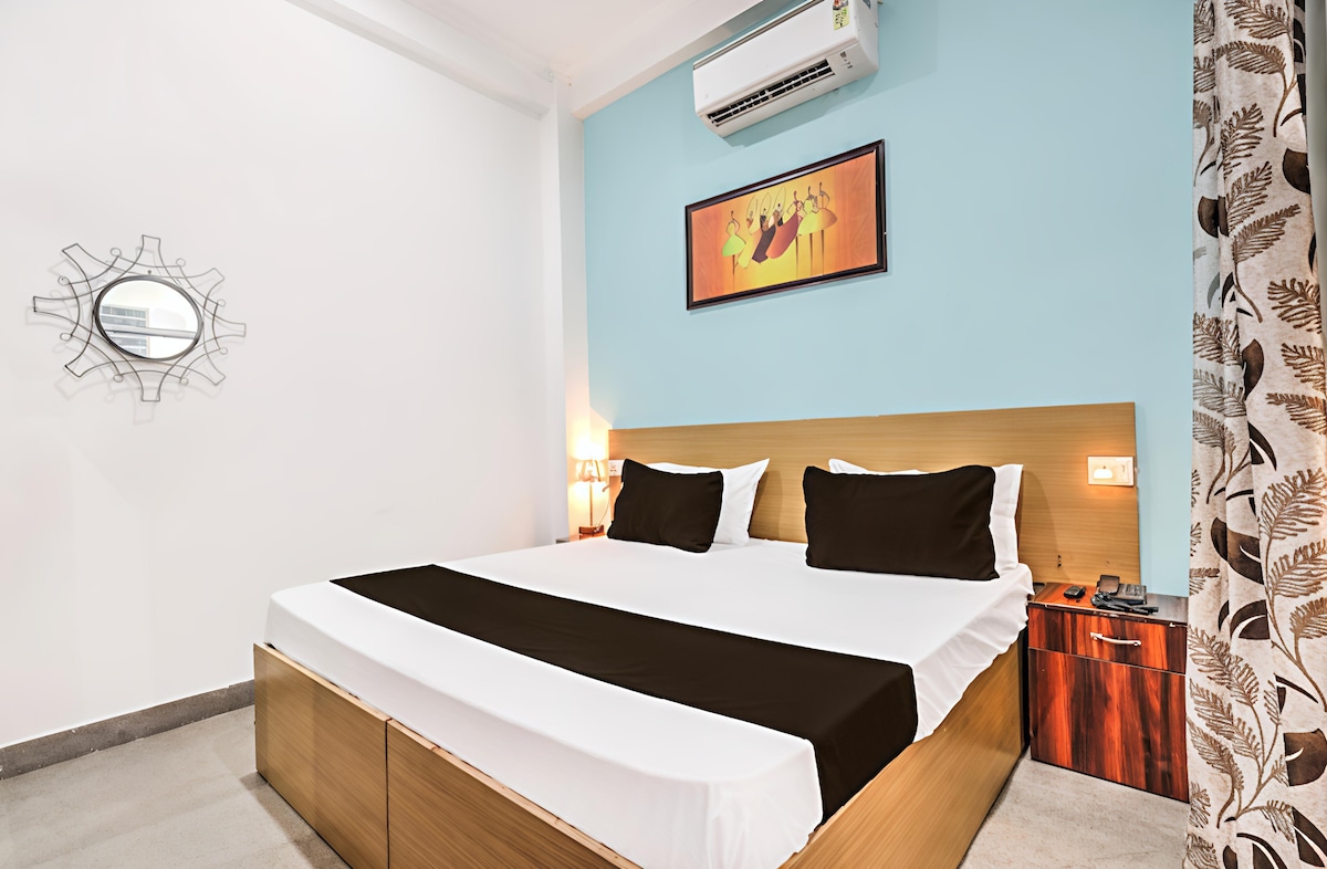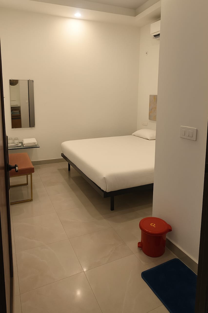 Modern Hotel Room with Premium Comfort Relax in our stylish hotel room featuring a comfortable queen-size bed, private bathroom, flat-screen TV, and complimentary Wi-Fi. Guests enjoy - Nice City View from the window. Housekeeping ( ON - Call ) Access to hotel amenities including the In-house restaurant. RO water Induction for light cooking. Kattle Fresh Towels Fresh Hand towels. Mini Fridge. Kitchen utensils.
