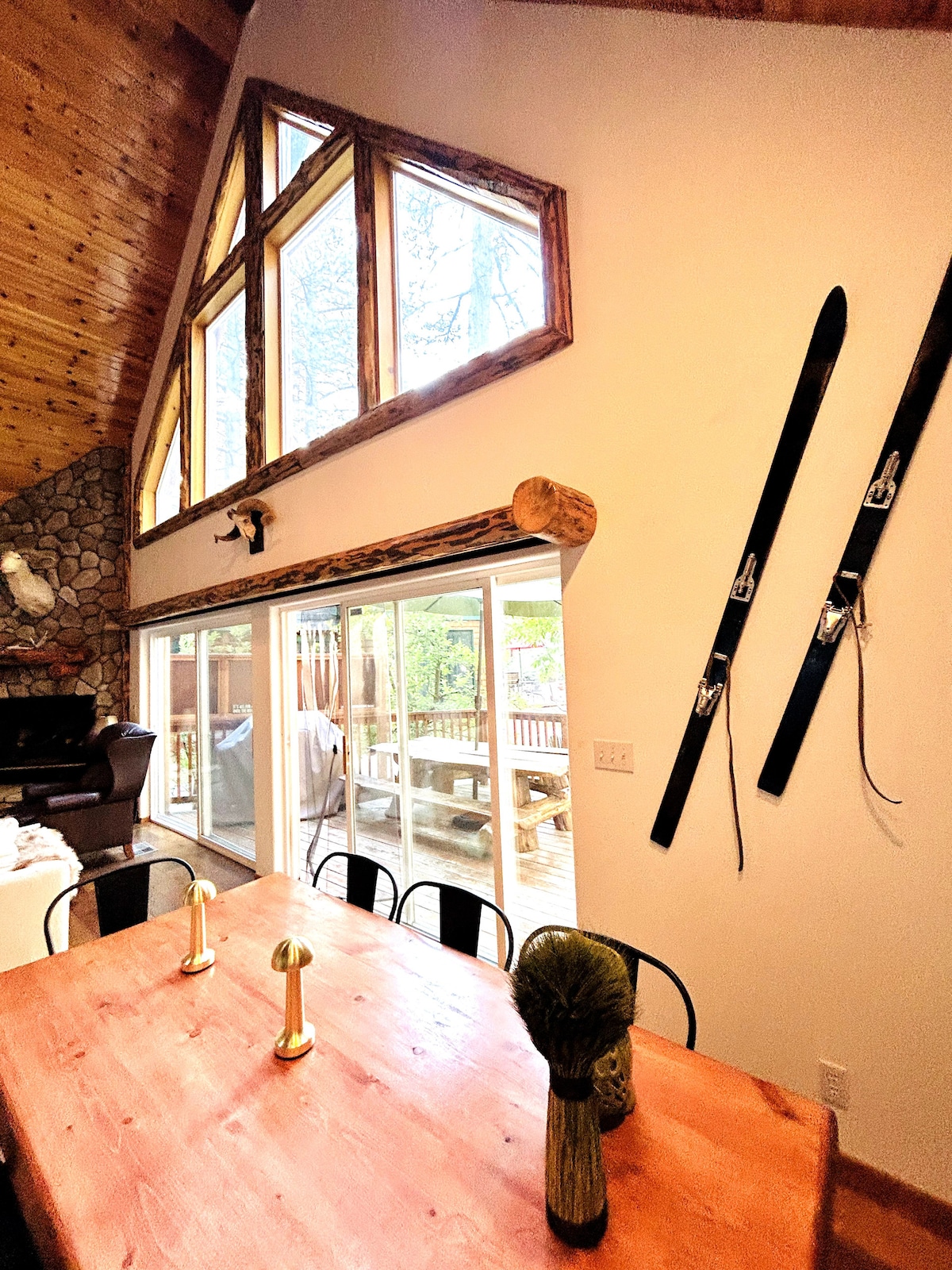 Idħol f'post verament kenni fil-muntanji f'din id-dar A-Frame awtentika tal-injam, f'foresta kwieta qrib Big Bear u l-Lag Arrowhead, ftit passi bogħod mil-lag. Din il-kabina tinsab f'post ideali għall-esperjenzi tal-muntanji matul is-sena kollha—minn ġranet qrib il-lag sa vjaġġi tal-iskijar. L-intern b'injam li jagħti sensazzjoni ta' sħana, is-soqfa għoljin u t-taraġ spiraliformi joħolqu atmosfera ta' lodge li tħossok komdu fiha, b'żewġt ikmamar tas-sodda fis-sular t'isfel u loft li jservi bħala t-tielet kamra tas-sodda—biex b'mod komdu jistgħu jorqdu sa sitt persuni.