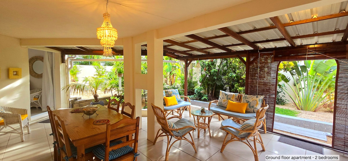 Il-veduti tal-muntanji huma għall-għasafar! ;-) Din id-dar komda li tinsab fiċ-ċentru, 350 metru 'l bogħod minn supermarket mgħammar sew u 3 minuti sewqan sal-bajja, tistiednek tirrilassa jew toħroġ għal għażla wiesgħa ta' ristoranti fil-qrib. F' passat kwiet, imdawwar bil-ħaxix, gawdi bilqiegħda fuq terrazzin tal-injam, tħares lejn il-pixxina komuni jew tirrilassa fuq il-gallarija tal-ewwel sular filwaqt li tara nżul ix-xemx tropikali mill-isbaħ u veduti tal-baħar, li tagħti fuq Le Morne. Servizz ta' tindif inkluż tliet darbiet fil-ġimgħa
