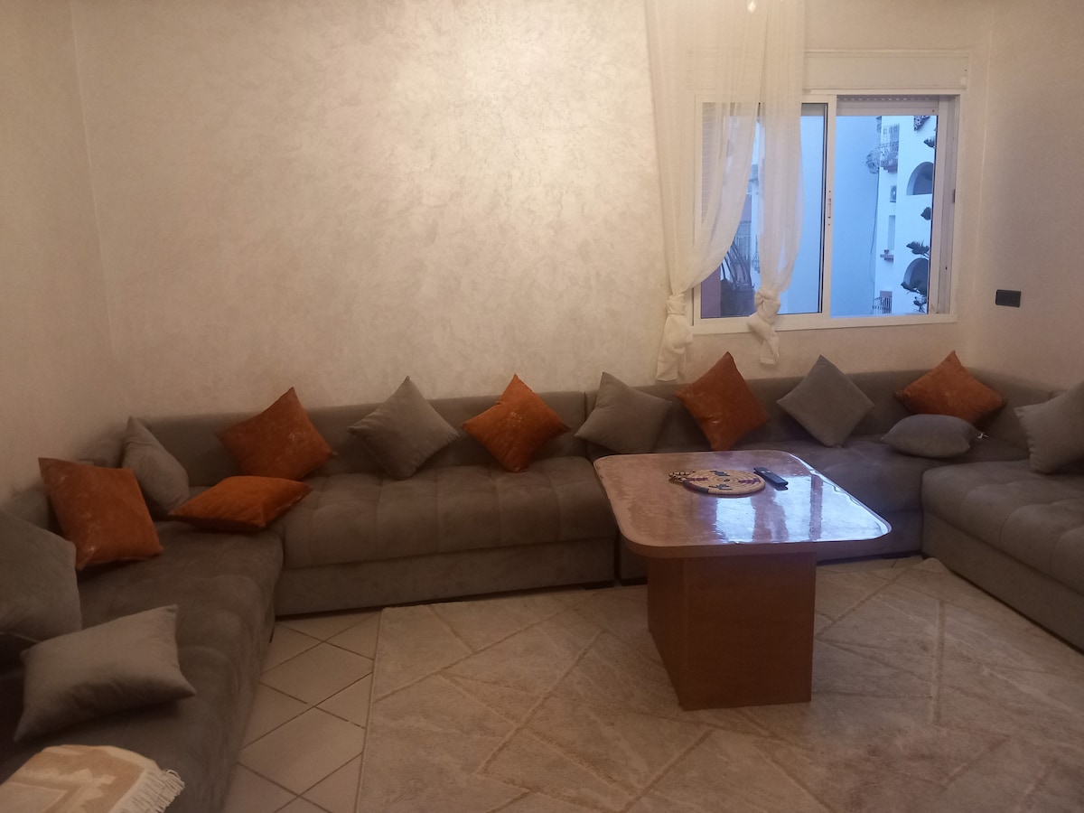 Ce logement paisible offre un séjour détente pour toute la famille, à moins de 20 Mint (14Km) de l'aéroport international d'Agadir. l'appartement situé dans un quartier bien calmer devant une terrasse fermée pas du bruit de voiture juste parking, style Marocaine loin du bruit de la route. 2 MINT de l'arrêt du Bus et 5 mint au marché du fruits et légumes près du Golf du soleil et Park National, forêt pour les gens qui aime la marche ou le sport.