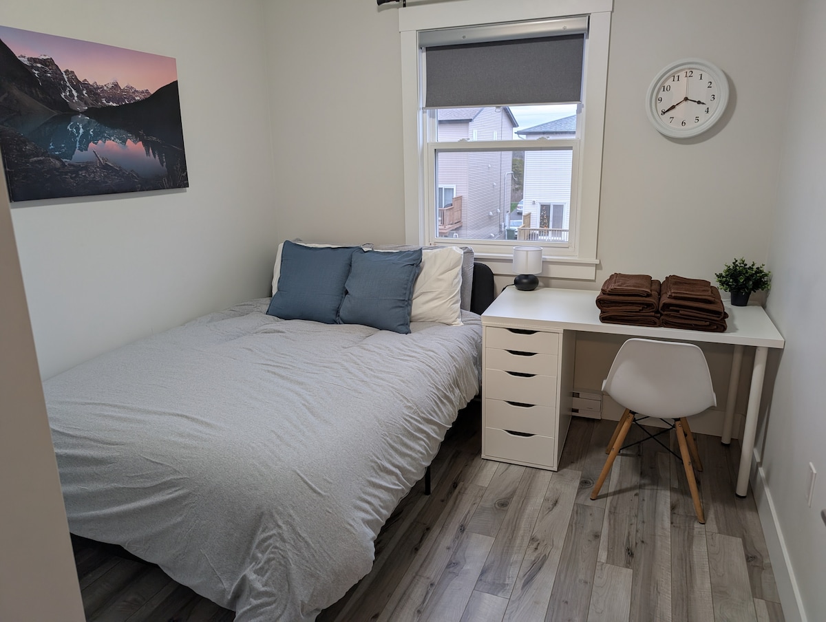 Appartament imdawwal u xemxi li jħares lejn in-nofsinhar fit-tieni sular, li jinsab f'post komdu lejn iċ-ċentru ta' Halifax. Dal, SMU u sptarijiet, 10-15-il minuta mixi. Sodda king size. (jekk il-booking ikun itwal, nistgħu noffru żewġ sodod ta' wieħed). Magna tal-ħasil/Dryer Kamra tal-banju privata b' banju u doċċa Kċina żgħira : Sink doppju - Microwave- Friġġ- Hot-Plate, Air fryer, magna tal-kafè għall-kafè mitħun. Pompa tas-Sħana/ AC Roku TV disponibbli għall-apps personali.