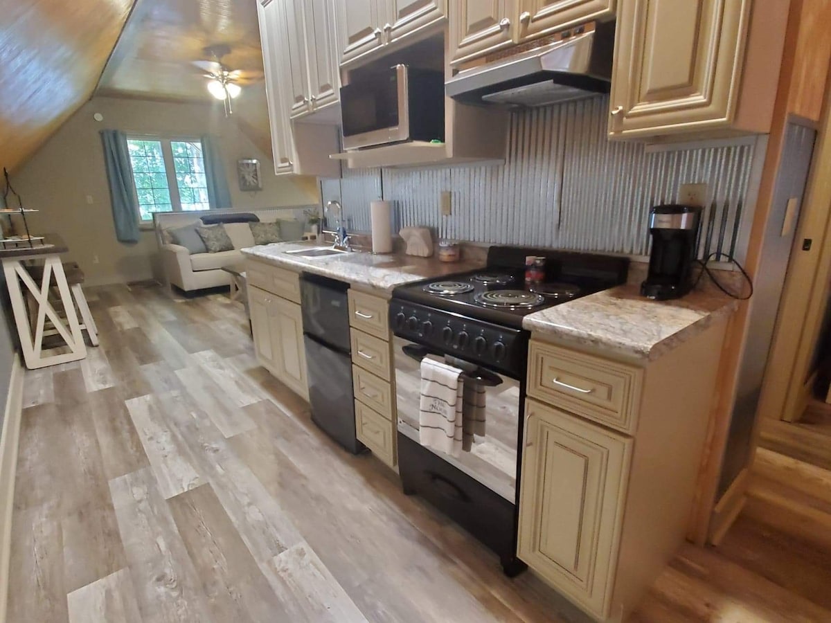 Located on the Tenn-Tom River just 1 mile from Downtown, this 500 sq ft upstairs carriage house will relax you with its waterfront view. The exterior is rustic continuing with cottage charm inside. You can relax on the sofa in the comfort of the living room, take a quiet nap in the bedroom or enjoy a game of Pacman. Try grilling with a great water view on the porch or swing. For a change of pace, 2 kayaks & a canoe are for your enjoyment!