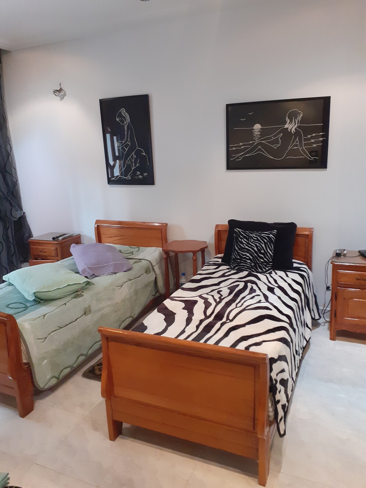 GĦALL-KIRI ta' appartament s+2 mgħammar faċċata tal-ilma 50m 'il bogħod mil-lukanda SINDBAD Hammamet Nord, b' aċċess privat dirett għall-bajja (mhux residenza), kċina mgħammra sew, żewġ kmamar tas-sodda (veduta tal-baħar), kamra tal-banju, salott u terrazzin kbir ħafna b' veduta tal-baħar. Kolazzjon wieħed jinkludi (trid tagħżel il-jum )
