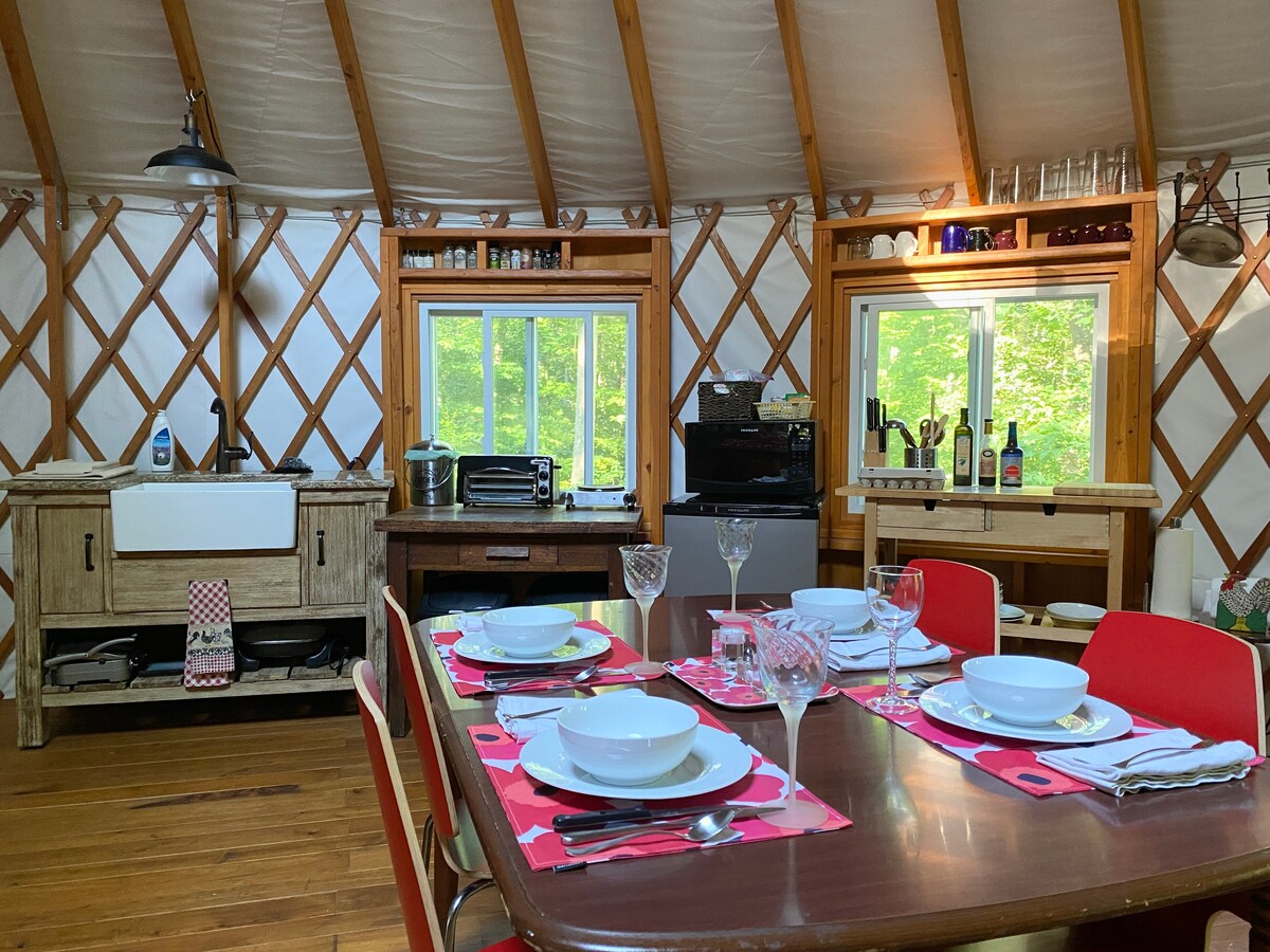 Gawdi vaganza unika fin-natura u rilassa f' ambjent paċifiku bis-siġar ta' 10.3 ettari fil-Yurt b' dijametru ta' 30’tagħna, li jorqod 4 ġewwa North Guilford, CT. Din id-dar ċilindrika għolja toffri solitudni u terrazzin kbir b' siġġijiet komdi u veduti tal-foresta. Dell u frisk fis-sajf b 'arja kkundizzjonata u fannijiet disponibbli. Dan il-Yurt jipprovdi mistrieħ mill-isbaħ mid-dinja ħerqana. Ideali għal dawk li jħobbu n-natura b' nixxiegħa fil-qrib u mili ta' mogħdijiet għall-mixjiet fit-tul u għar-roti fil-muntanji.