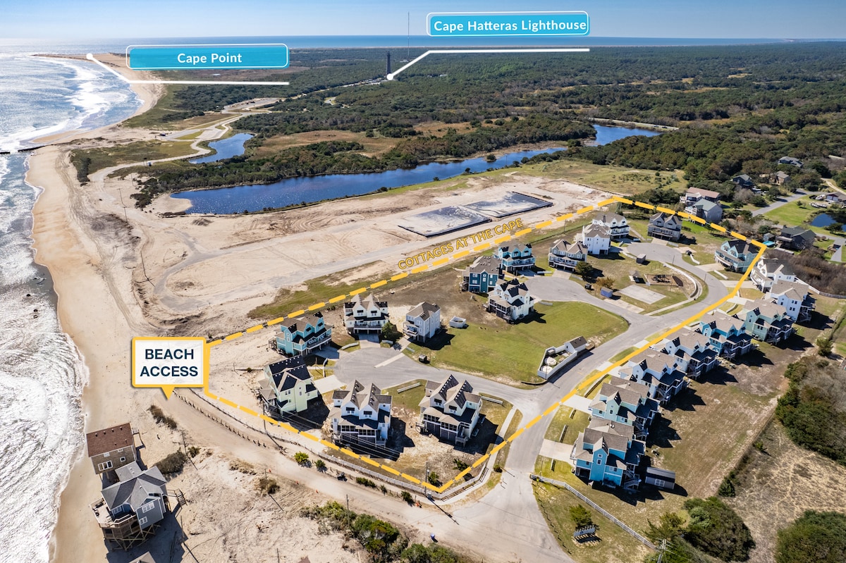 Escape to Whale, a bright and cheerful 4-bedroom, 2.5-bath Buxton townhome where family comfort meets the serene Outer Banks charm of Hatteras Island. Perfectly situated in the coveted Cottages at the Cape community, this Outer Banks townhome offers easy access to the beach, stunning glimpses of the Cape Hatteras Lighthouse, and proximity to Buxton’s quiet shops, restaurants, and famed jetties—renowned for some of the best fishing and surfing on the island.