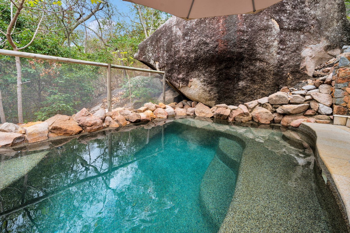 Our Granny Flat is a tranquil oasis, set high up in the palm trees overlooking our swimming pool. Lorikeets whizz by, butterflies cruise by and you'll hear the occasional train toot. We're located in a lovely suburb walking distance to the QCB Stadium, less than 10 min drive into the city and extremely popular Strand area and restaurants. The entire Granny Flat is yours with private access, kitchen and living area, separate bedroom with queen sized bed and ensuite with rain shower.