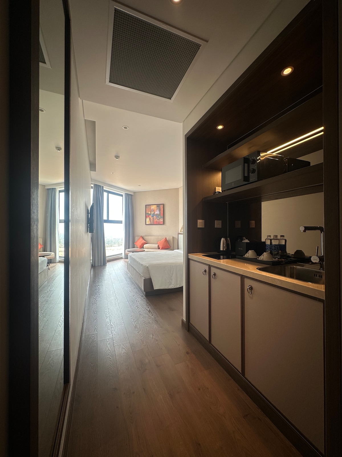 Studio with ocean view, sunrise view from the room. Breakfast with fast foods as Continental breakfast: just buy some eggs to make scrambled eggs, fried eggs, boiled eggs… a cup of coffee or tea… Small kitchen but you can cook what you prefer Good showers under hot water could make your new day really happy… Beach, pool lounge are free. Pay when you like to use Hotel services as pools, gym, sauna, massages, mud bath, breakfast buffet…