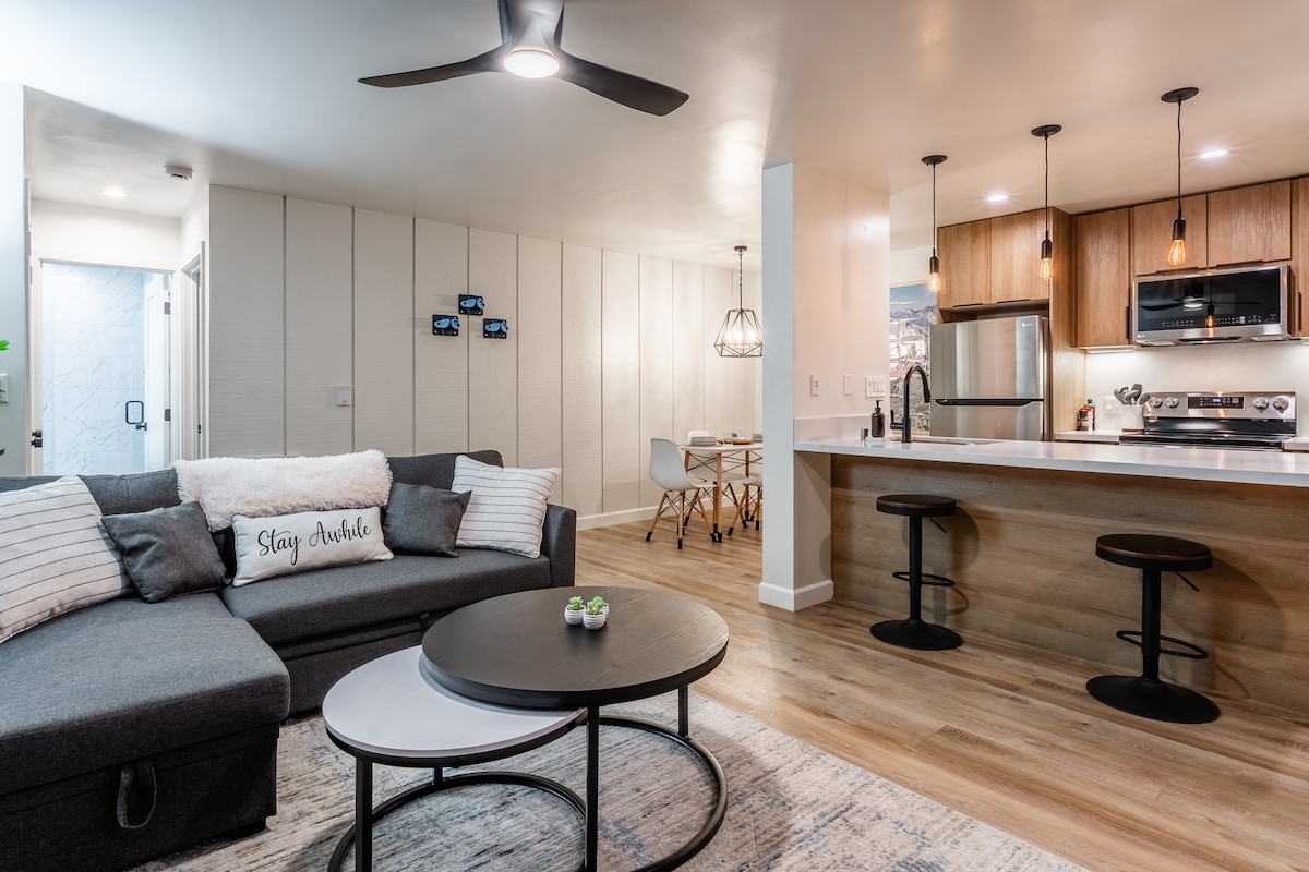 Post tajjeb! Dan il-kondominju nadif, kbir, kwiet, immudellat mill-ġdid reċentement 1BR jorqod 4. Żgur se jogħġbok il-kċina tal-kunċett mgħammra b 'kollox, miftuħa, kamra tal-banju rranġata u għamara ġdida fjamanta. Orqod f 'kumdità lussuża fuq is-sodda bil-memory Size King Size jew duq is-sufan kbir. Din l-unità tal-kantuniera t 'isfel mdawla u li tħares lejn in-Nofsinhar fiha wi-fi mingħajr limitu, TV intelliġenti ta' 55"u parkeġġ huwa biss ftit passi 'l bogħod mill-bieb ta' barra. Qrib l-iskiing, il-karozza tal-linja, il-park, il-mogħdija tar-roti, l-ikliet, id-divertiment, s-sajd u l-golf.