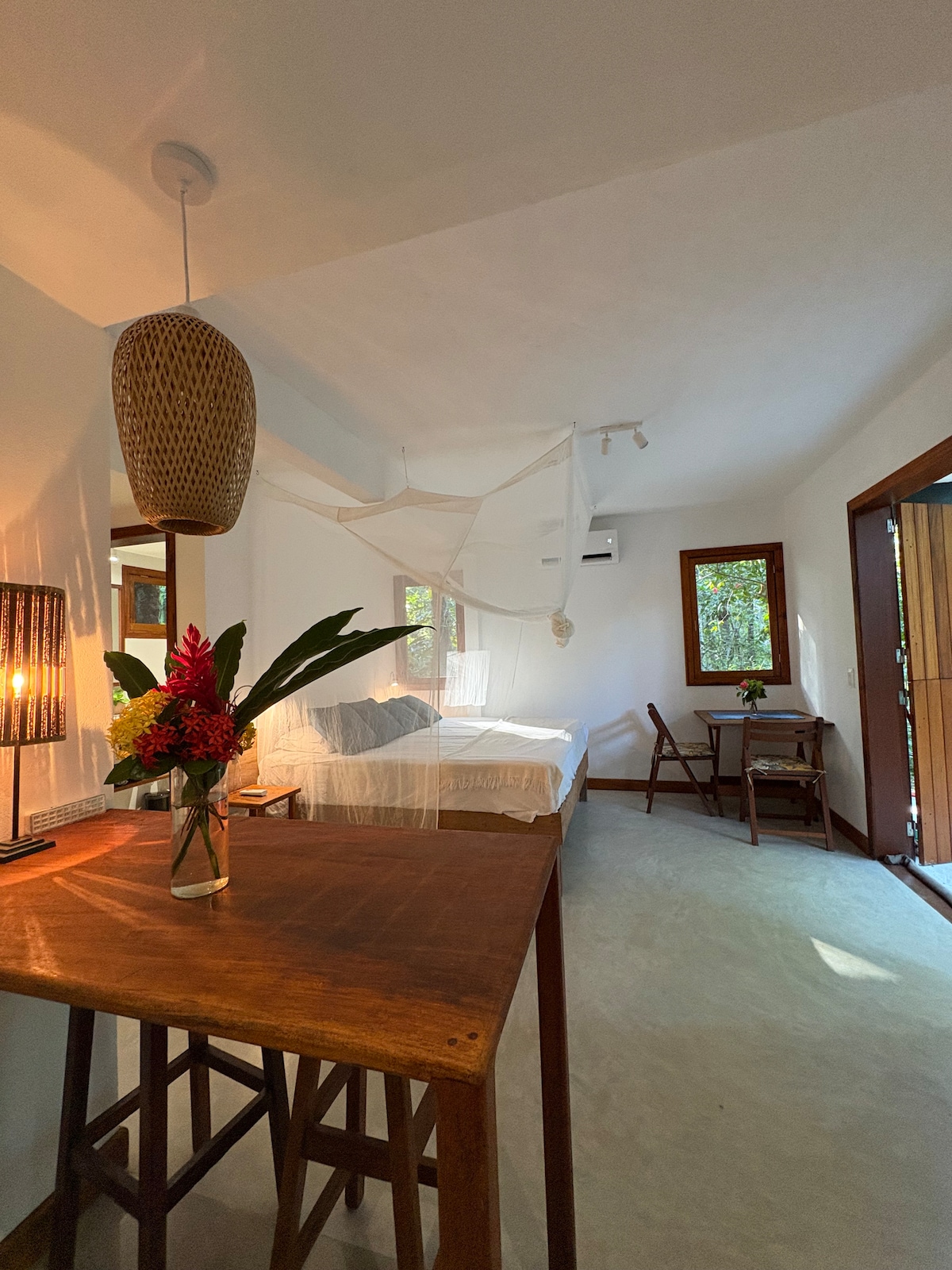 Procurando um refúgio tranquilo perto da praia? Aqui você encontra quartos amplos, arejados e cercados pela natureza, todos com ventilador e cozinha equipada, perfeitos para quem valoriza praticidade e simplicidade. A varanda oferece uma vista encantadora, ideal para relaxar e se reconectar. Estamos a apenas 160 metros da Praia Boca da Barra e a uma curta caminhada do centrinho da ilha, com ótimos restaurantes e comércios por perto.