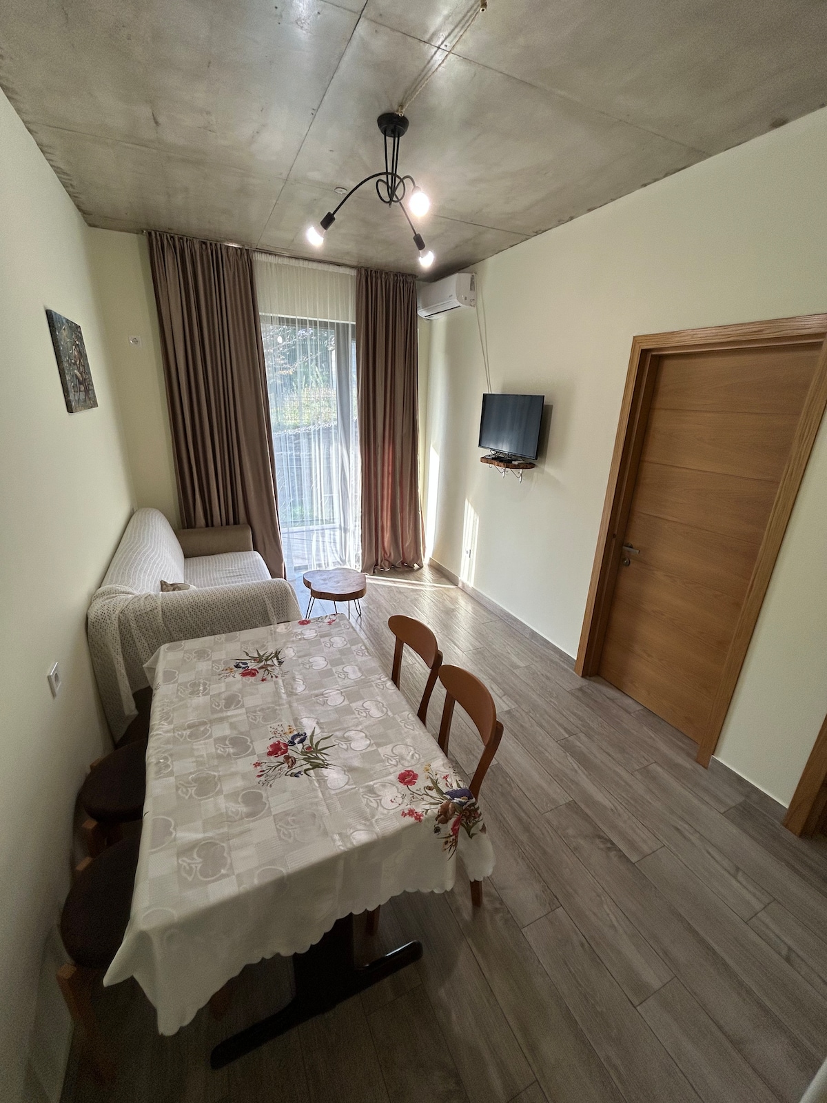 Gawdi żjara eleganti minn qrib ħafna taċ-ċentru tal-belt (4 km) appartament ĠDID fl-ewwel sular b 'terrazzin u veduta tal-ġnien sabiħa ħadra. Il-klijent se jsib appartamenti mgħammra kompletament u mdawla sew, bil-kumditajiet kollha li l-klijenti jista 'jkollhom bżonn għal żjara qasira jew għal żjara twila! L-ispazju huwa mgħammar bi friġġ, kitla, magħmula bl-idejn (minni)) aċċessorji tal-injam naturali u l-kumditajiet kollha meħtieġa għal żjara komda) Trasferiment ta 'Ajruport b' XEJN mill-Ajruport ta 'Kutaisi jista' jsir jekk tibbukkja 5 ijiem jew aktar!