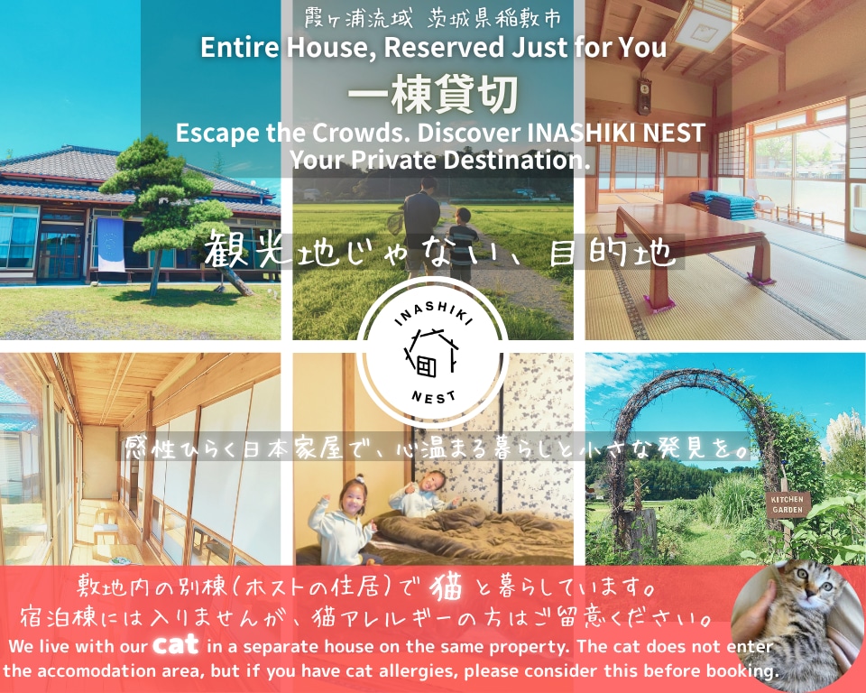 [Skont għal mill-inqas 2 iljieli, limitat għal grupp wieħed kuljum] INASHIKI NEST tinsab madwar 90 minuta bil-karozza 'l bogħod minn Tokyo u madwar 40 minuta' l bogħod mill-Ajruport ta' Narita.Din hija lukanda tradizzjonali Ġappuniża fil-kampanja kwieta qrib Kasumigaura, fil-Belt ta' Inashiki, il-Prefettura ta' Ibaraki. Tista' tgawdi minn żjara li tiftaħ il-ħames sensi tiegħek f' dar Ġappuniża nostalġika b' pajsaġġ bħal "Il-Ġar Tiegħi Totoro". Hemm ġnien żgħir tal-kċina quddiem il-listing, fejn jitkabbru l-ħxejjex u l-ħxejjex aromatiċi tal-istaġun. Kif tiġbor il-ħxejjex aromatiċi fil-ġnien tal-kċina u tistrieħ fuq it-tapit tatami.Ħin għat-tfal u l-adulti biex jirrilassaw waqt li jisimgħu l-ħsejjes tal-għasafar u r-riħ. Suġġeriti għall-familji u l-gruppi li jixtiequ jirrilassaw f' ambjent kwiet '◉il bogħod mix-xogħol u li jixtiequ jirrilassaw u jgawdu l-kampanja mat-tfal tagħhom. Minħabba li mhijiex destinazzjoni◉ turistika, hemm ambjent u spazju kwieti, u l-host jgħix f' dar oħra fl-istess propjetà, għalhekk tista' sserraħ moħħok li se nieħdu ħsieb it-tindif u l-immaniġġjar. ◉M' hemm l-ebda stazzjon fil-qrib, għalhekk jekk jogħġbok ejja bil-karozza jew bil-karozza għall-kiri. Hemm żewġ kmamar◉ tad-doċċa, għalhekk anki l-gruppi jistgħu jużawhom mingħajr ma jistennew.(l-ebda banju)