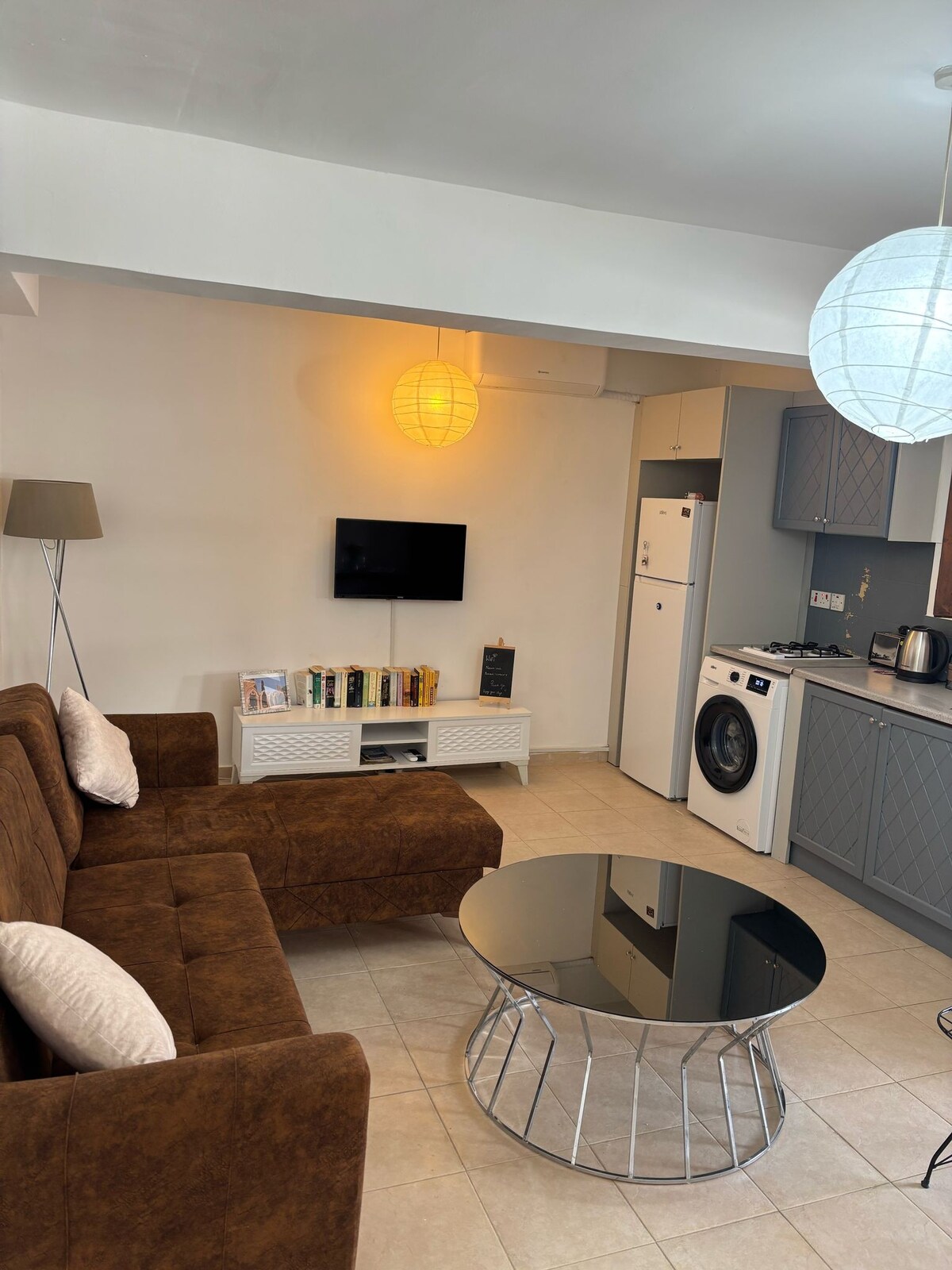 Welcome to your coastal escape in Alsancak, where sea breeze, mountain views, and Mediterranean charm meet. 🌊🏝️ This stylish one-bedroom apartment is perfect for two guests, featuring a cozy lounge 🛋️, fully equipped kitchen 🍳, and restful bedroom 🛏️. Nearby: 📍 1.5 km – Merit Hotels & Casino 🏖️ 3 km – Escape Beach 🌳 3.5 km – Alsancak Park Enjoy peaceful surroundings and access to a shared pool 🏊♂️. Relax, recharge, and embrace the beauty of Alsancak. 🌅