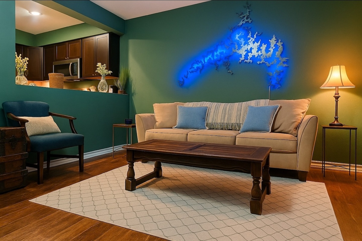 🛑 Tressa Tgħid: "Tibqax Tqis u Ibbukkja!" Il-vjaġġ tiegħek ta' 5 stilel lejn Branson! M'hemm l-ebda taraġ. ☕ Ritwal ta' Filgħodu Mingħajr Għaġla: Ibda l-jum b'kafè fil-kamra tax-xemx. Ħares lejn id-dawl tal-għodwa fuq il-lag u gawdi l-paċi li joffri. Kumditajiet: • Bar tal-kafè • Sodod Luxe king • 4 Smart Roku TVs • Wifi veloċi • Il-logħba Arcade Post perfett! 🏞️ Post imħares u nadif tazza biż-żona perfetta: paċi u kwiet, imma biss 12-il minuta 'l bogħod minn Silver Dollar City u 8 minuti 'l bogħod mill-Istrixxa.