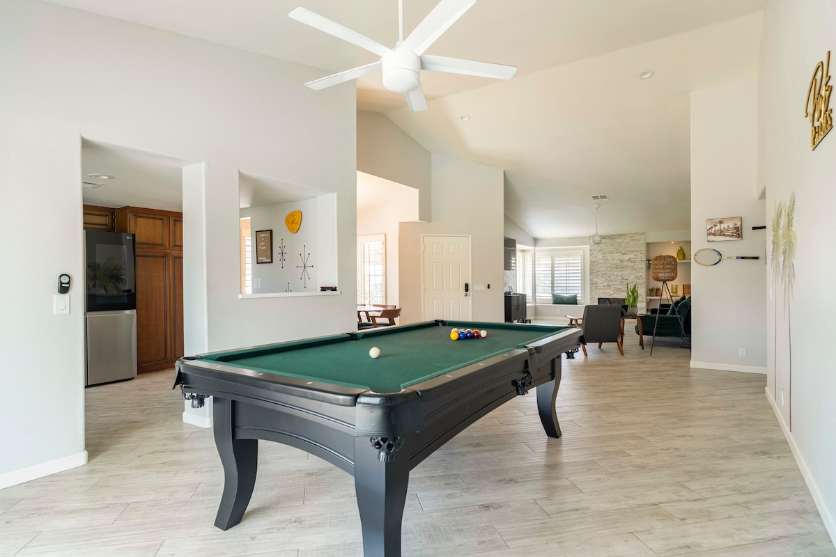 Aħrab lejn l-oażi privata tiegħek fid-deżert—fejn ix-xemx, is-siġar tal-palm, u l-veduti tal-golf sereni joħolqu l-vaganza perfetta f'Indio. 💦 Pixxina tal-ilma mielaħ u tisħin tas-spa b'xejn 🎮 Kamra tal-logħob: mejda tal-pool, ping pong, arcade u smart TV 🛏️ 10 Postijiet fejn Torqod: 2 Sodod Kbar, Sodda Doppja, Sodda Doppja+Bunk Sħiħ 🍳 Kċina tal-kok + kafetterija 🔥 Fossa tan-nar, BBQ, ikla u lounge fuq barra 🎾 Tennis, pickleball u gym (4 klijenti) 🚗 Qrib Indian Wells, La Quinta u Joshua Tree