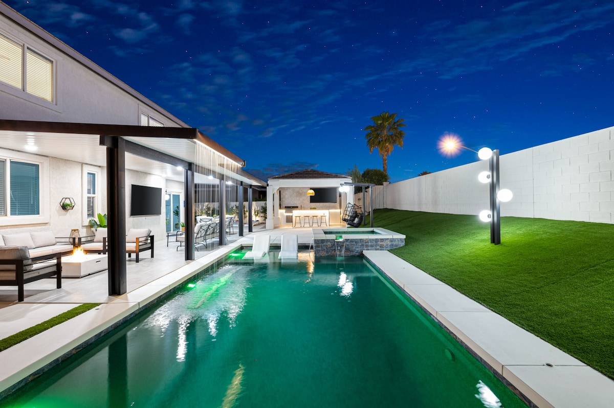 Merħba f' "INTERSTELLAR"! 23 klijent jistgħu jorqdu komdi f' din il-5 kamra tas-sodda, 3 dar tal-banju! B' kollox hemm 1 King, 3 Queen, 5 doppji, 3 sodod singoli u sufan queen 1. Id-dar il-ġdida tagħna għandha karatteristika tal-ilma tal-purtieri tax-xita, bitħa mfassla b' mod eċċezzjonali, żona tal-kċina fuq barra, kamra tal-logħob divertenti u kumditajiet bla tmiem. Qrib avvenimenti bħal Coachella, Stagecoach, BNP Paribas u Acrisure arena.