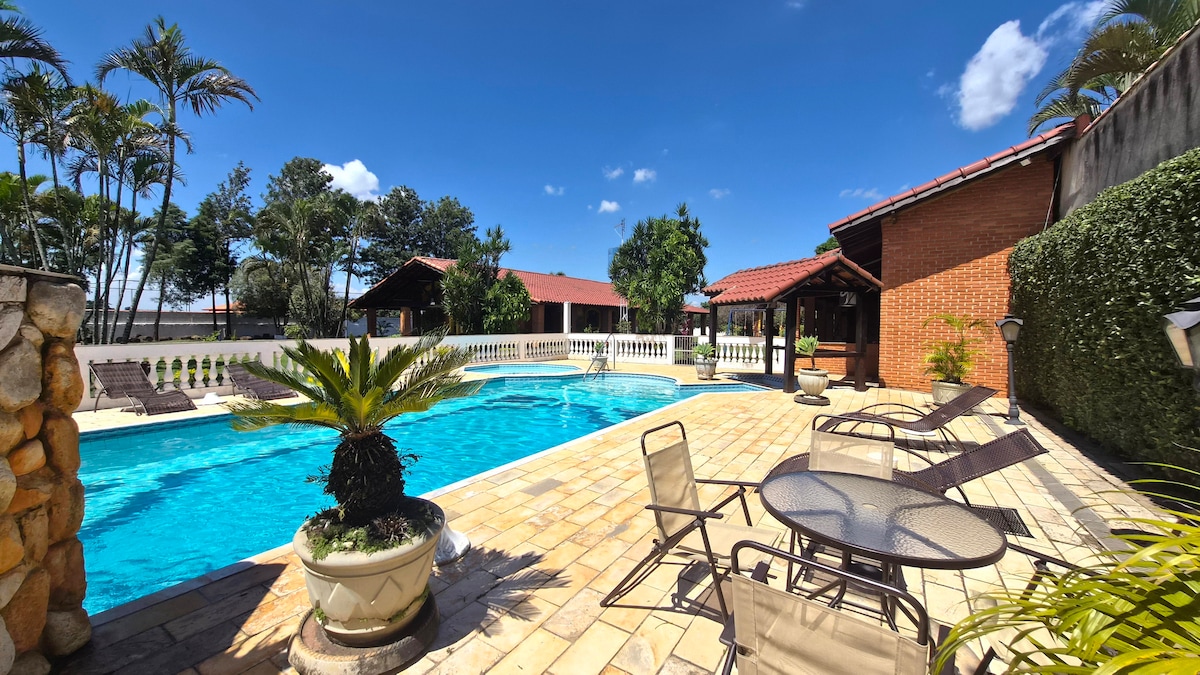 Il-propjetà tkopri 5,000 metru kwadru, b' pixxina qrib iż-żona tal-barbecue, grawnd sportiv u kamra tal-logħob kompluta (biljard, foosball, table tennis, logħob tal-vidjow u mejda tal-karti). Dan joffri malja Wi-Fi b' internet bil-fibra ta' 600 Mbps, TV bis-satellita, arranġament ta' sular wieħed, art ċatta, park tal-logħob għat-tfal, u ħafna spazji komunali, kemm fuq ġewwa kif ukoll fuq barra! Tinsab siegħa 'l bogħod biss minn São Paulo! Id-dar tinsab biss 10 minuti bil-karozza 'l bogħod miċ-ċentru tal-belt u miċ-Ċentru Skydiving u l-Bużżieqa.