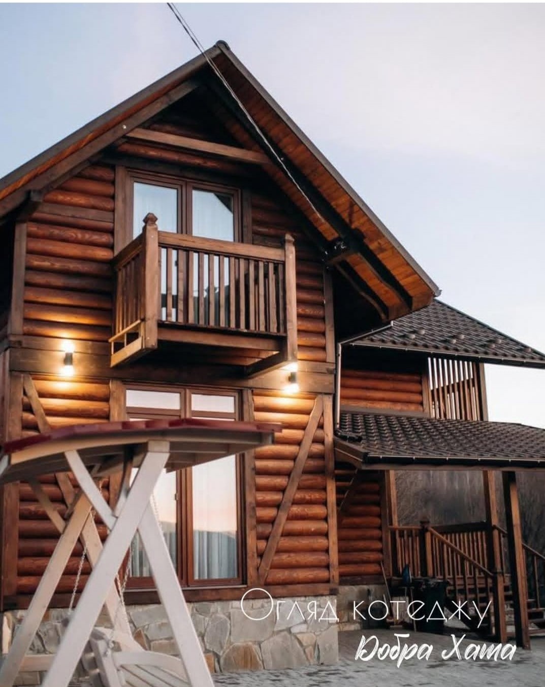 Здається деревяний Котедж , басейн , сауна, відпочинковий зал ,, супутникове ТБ, WI-Fi , Безкоштовна парковка для авто , Кухня , холодильник, електрочайник, столовий та чайний сервізи, та багато чого іншого. 3 спальні (4 двохспальні ліжка), 3 санвузли (душова кабіна у кожні кімнаті, унітаз, умивальник), кількість рушників – 2 на особу. Балкон з видом на гори . За Додаткову Оплату є Кухар який може готувати для вас.