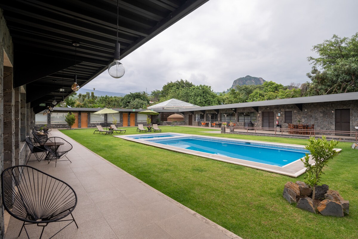 L-arkitettura moderna Messikana tal-istil Barragán ġewwa Rancho Cortés sabiħa, l-iktar żona privileġġata għall-klima friska ta' Cuernavaca b' veduta straordinarja ħdejn xatt. Casa Nardo hija dar kompletament privata u sigura b' 4 ikmamar tas-sodda maħsuba biex tirrilassa/tiddeverti, 15-il minuta sewqan 'il bogħod miċ-ċentru, post għall-kwiet imdawwar bin-natura. Tajjeb għal koppja jew familja/ħbieb, sa 9 klijenti, addattati għall-pets. Terrazzin, pixxina (ħiter mhux obbligatorju) ġnien, ideali għal vaganza għal tmiem il-ġimgħa jew żjarat twal għall-vaganzi. Grawnd tal-Pickleball ĠDID!