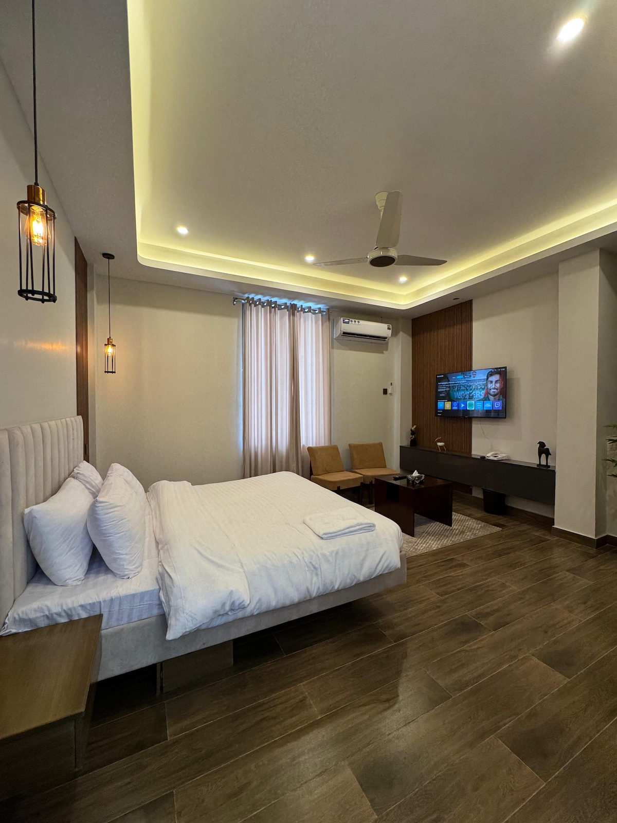 Luxury 2-bedroom penthouse with a master bedroom, separate living and dining area, and a small kitchen with microwave, refrigerator, and hotplate. Spacious and comfortable with beautiful city views, ideal for families and long stays. Located near Earthquake Memorial Bridge, Neelum & Jhelum River View Point, Red Fort (Rutta Qila), Gojra Bazaar, Subri Lake, and Dhani Waterfall. Perfect location for tourists and travelers.