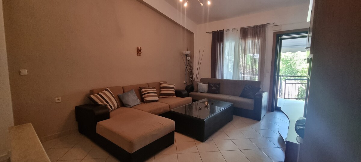 Dan il-post eleganti u komdu fejn toqgħod huwa ideali għall-vaganzi tas-sajf żewġ passi 'l bogħod mill-baħar, li jħarsu lejn il-bajja ramlija ta' Kalamitsi Akti bil-gżira karatteristika. Il-propjetà għandha 2 ikmamar tas-sodda b 'żewġt ikmamar doppji u doppji rispettivament. Kamra tas-salott u gallarija spazjuża u moderna bil-kċina b 'veduta tal-baħar kif ukoll parkeġġ privat. Il-kosta għandha għażliet tal-ikel, supermarkets, sport tal-ilma u skola tal-għadis f 'distanza bil-mixi.