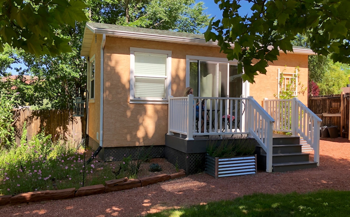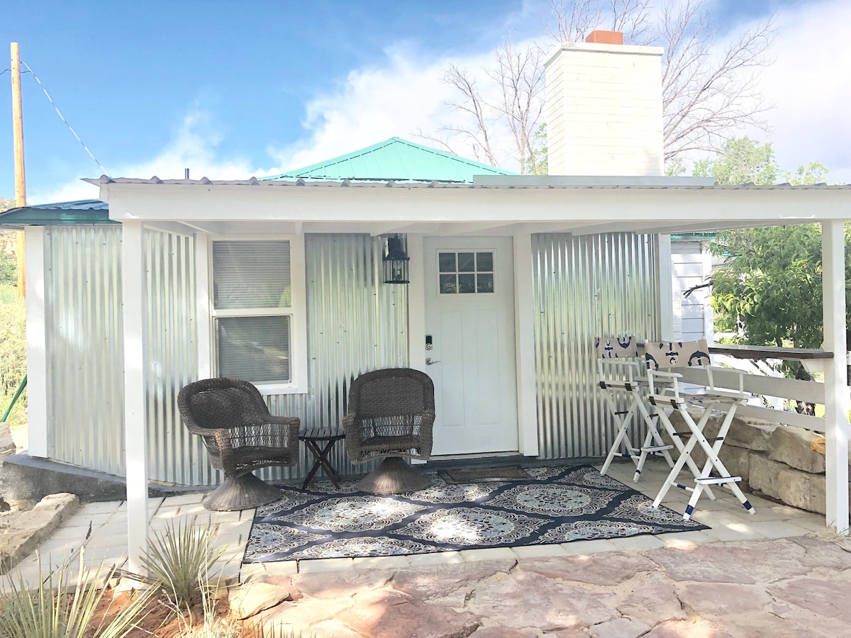 This "tiny house" is the perfect home base. Queen size bed with memory foam mattress. Seating/dining area. Kitchen with 2-burner cooktop, microwave, toaster oven, Keurig. Flatscreen TV with Netflix and Prime. Wi-Fi. Bath with shower. Private deck with bistro set overlooks lush backyard. Shared propane grill & fire pit. NO children NO pets. 3 blocks to groceries, downtown, restaurants & hiking trails. Kanab Business License #3909 Check out my other vacation rental - Kanab Cottage