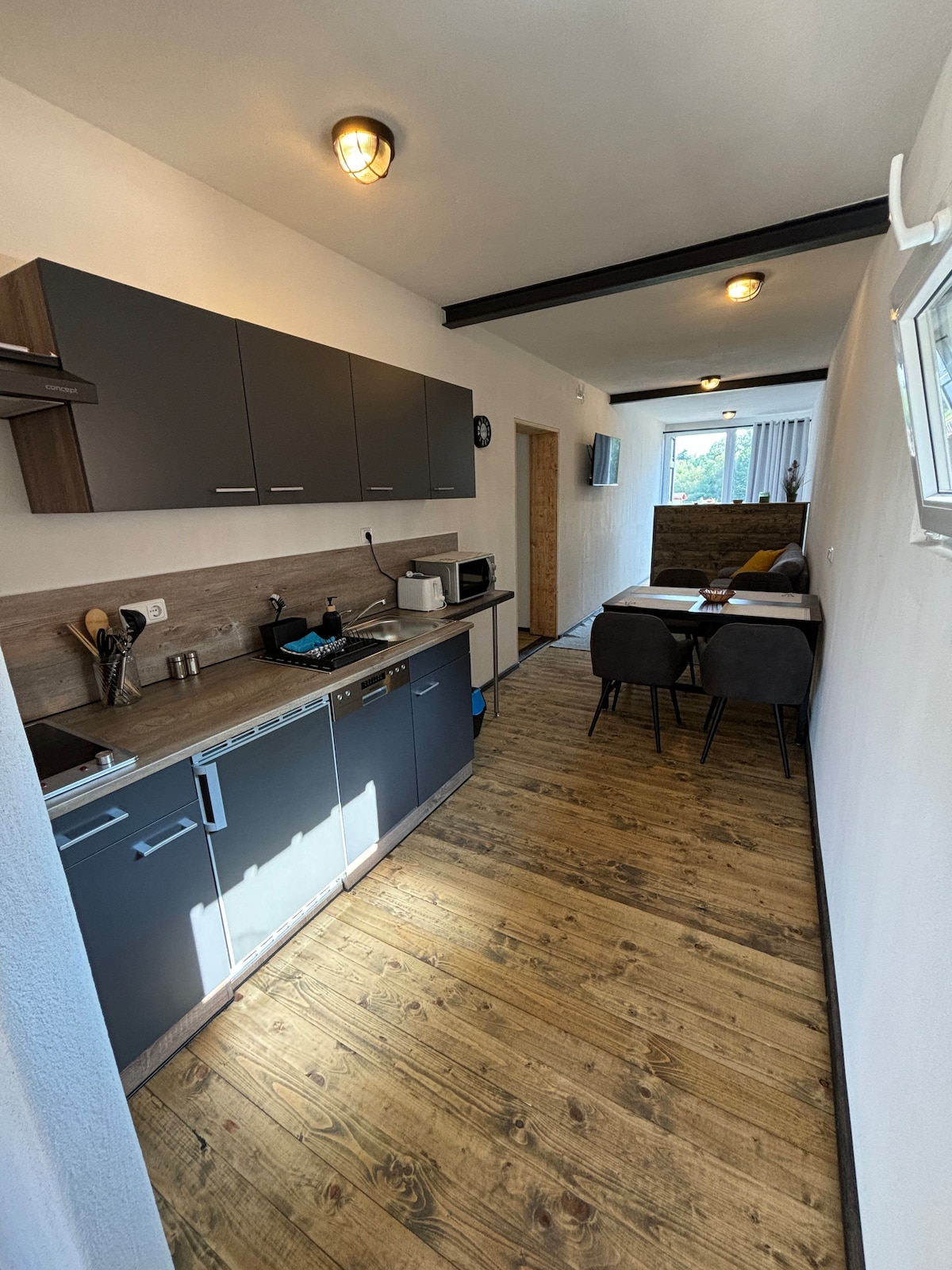 Gawdi żjara pjaċevoli f 'post kwiet fejn tista' tmur mixja fit-tul, ċikliżmu, taħdem jew sempliċement tirrilassa. L-appartament għandu d-daħla u t-terrazzin tiegħu stess. Il-kċina miftuħa mgħammra kompletament (forn, microwave, magna tal-kafè) toffri spazju għal familja jew sa erba 'persuni b' mejda tal-ikel kbira. Is-salott huwa mgħammar bħala kamra ta 'tranżitu għad-doċċa u t-tojlit b' skrivanija u sufan ieħor.