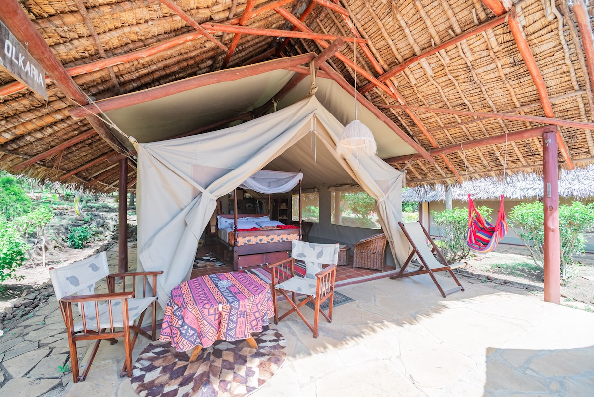 Vaganza romantika bil-ħaxix għal tnejn ġewwa Camp Onteppesi. Kemm jekk int koppja, ħbieb mill-qrib jew dawk li jixtiequ jagħmlu x-xahar tal-għasel, it-tinda doppja tagħna toffri privatezza taħt l-acacias. Gawdi l-iljieli ta' nirien fil-kampeġġ, veduti ta' tlugħ ix-xemx ta' Kilimanjaro u tara l-għasafar fil-ġnien tal-frott serju tagħna. Il-klijenti għandhom aċċess għal kċina fuq barra, nirien u kmamar tal-banju maqsuma mal-oħrajn. Ħarba paċifika fil-qalba ta' Amboseli.