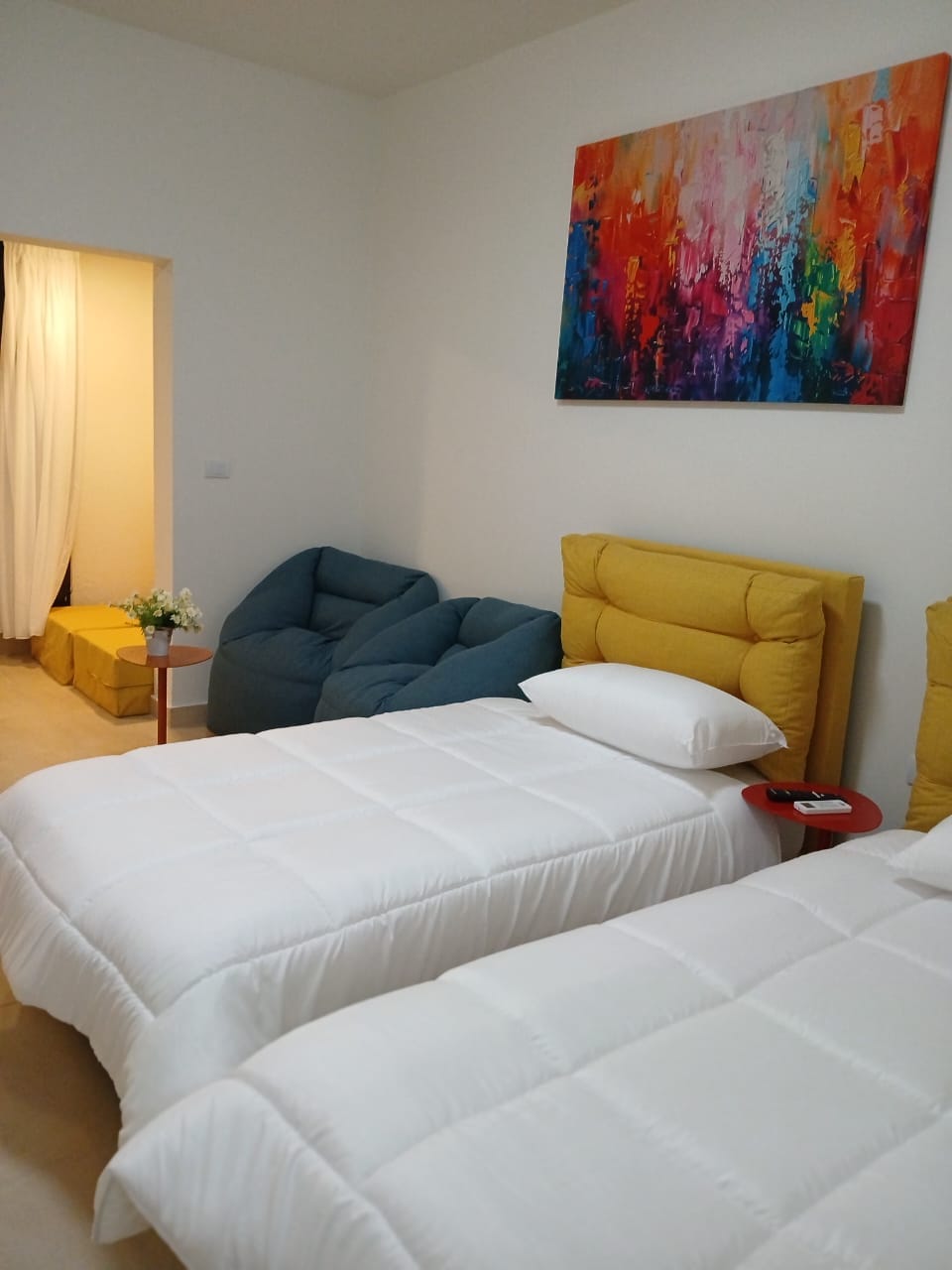 This beautiful 35sqm chalet,4th floor, renovated&furnished.Benefits of 2 single beds,1largeWC,2closets,AC,smartTV,1parking,24hr electricity&security.A cozy stay with stunning view of garden palms,sea.Perfect for a retreat&a relaxing gateway.The thoughtful layout&calming palette of this chalet is spacious enough to welcome&is ideal for couples with children.& benefits of 4pieces of tri-fold mattresses foldable&covered with removable cover.they are also used as a part of a floor seating corner.