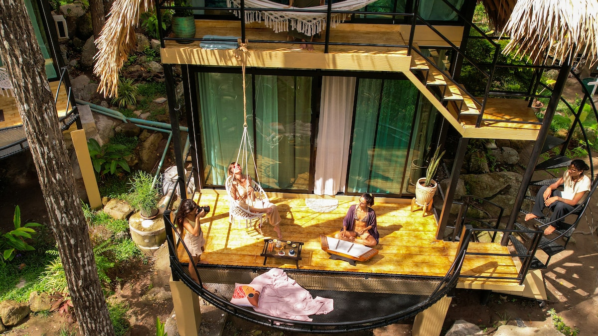 Shivari houses conscious wellness co-living: yoga, sauna, friendly vibe, vegan space. Eco-friendly rooms have bathtubs, AC, balconies, unique artworks, hammocks, the swings and boho decorations. This is a place where wild life meets the comfort, where you can also participate in community ceremonies and weekly best Ecstatic Dance on the island. There are many unique, beautiful public zones, the river.. be ready to meet friendly dogs - Rhodesian Rigbacks - who save us at the jungles.