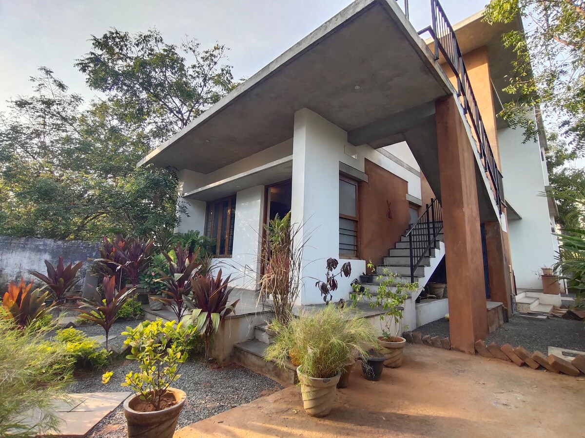 Id-dar tiegħek 'il bogħod mid-dar ġewwa Auroville ġiet imżejna b' togħma tajba. Kull rokna tad-dar tagħna hija Instagramworthy b 'interjuri kkuluriti, arti kolam, dekorazzjoni antika u aktar. Il-1BHK tista 'takkomoda b' mod komdu sa 4 persuni b' sodda swing u sufan sodda fis-salott. hile hemm ħafna ristoranti fil-qrib, il-kċina tagħna ġiet mgħammra bi ħsieb għall-bżonnijiet kollha tiegħek - kemm jekk tagħmel omeletta ta' malajr jew ikla Indjana sħiħa. Allura oqgħod bilqiegħda, irrilassa u ixrob il-kafè tiegħek.