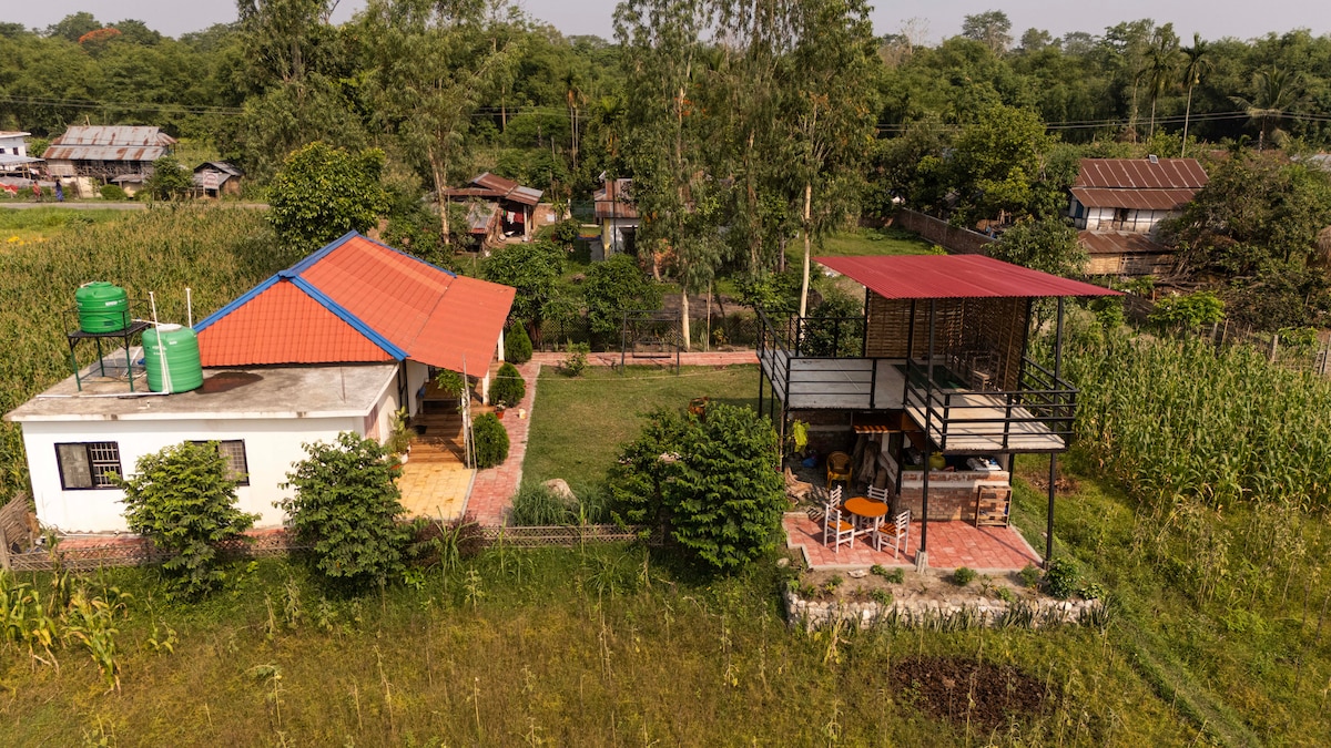Mangifera is a cozy, traditional wooden stay zone surrounded by lush mango trees in peaceful Saptari, Nepal. With its bright red roof, quiet garden courtyard, and rustic village charm, it’s the perfect escape for anyone seeking tranquility, fresh air, and an authentic Terai experience. Relax on the veranda, enjoy the greenery of mango trees, and unwind in a warm, homely atmosphere.