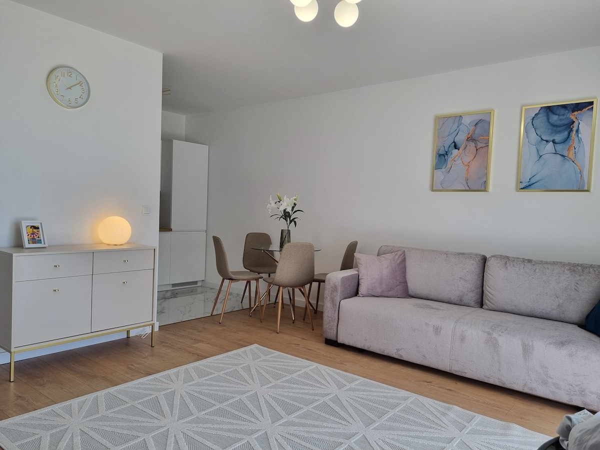 Appartament li għadu kif ġie rranġat fiċ-ċentru ta' Ustka, 8 minuti bil-mixi 'l bogħod mill-bajja. Dan jikkonsisti f' żewġ kmamar: kamra tas-sodda komda u salott b' sufan sodda. L-appartament għandu kamra tal-banju moderna u kċina mgħammra b' kollox: dishwasher, magna tal-ħasil-dryer, friġġ, forn. Il-post huwa estremament konvenjenti: 13-il minuta mill-istazzjon tal-ferrovija, 5 minuti mill-waqfa tax-xarabank u 2 minuti mill-ħanut. Qrib ristoranti u spa. Ideali għal vaganza rilassanti qrib il-baħar.