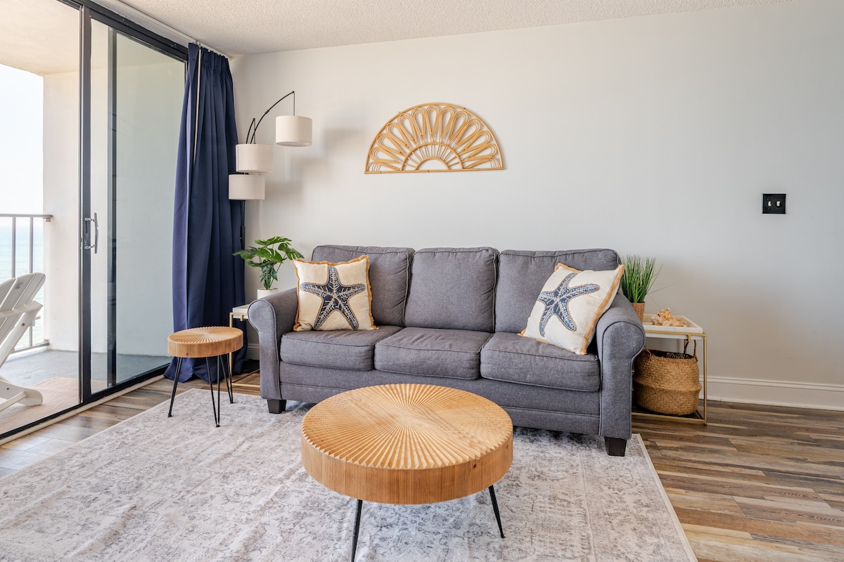 This spectacular ocean view condo with top notch 2022 renovations is just steps from the beach. Be swept away by the view of the rolling waves, whitecaps, and the OKI Pier as you relax and enjoy a beverage on the balcony. You will also be treated to a breathtaking sunset as the colors change each minute across the sky. Retire to the living room and rest your tired feet on a comfy sectional sofa as you interact with others in an aesthetically pleasing open floorplan setting.