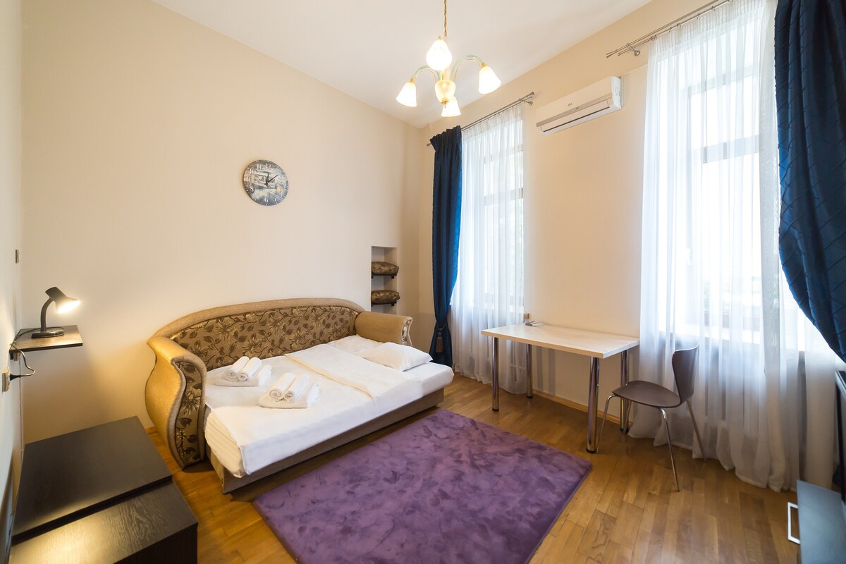 An artsy apartment in the very centre of the old town. Features high ceilings, a comfortable bed, a relic Soviet balcony, and a number of pieces by up-and-coming Ukrainian artists on the walls. The place is 5 min walk from Zoloti Vorota, 10 min walk from the Opera house and St Sophia Cathedral with its 260 m2 of authentic 11th century mosaics. Half of Kyiv's best known bars and galleries are in direct vicinity, along with the Landscape alley and St Volodymyr Hill.