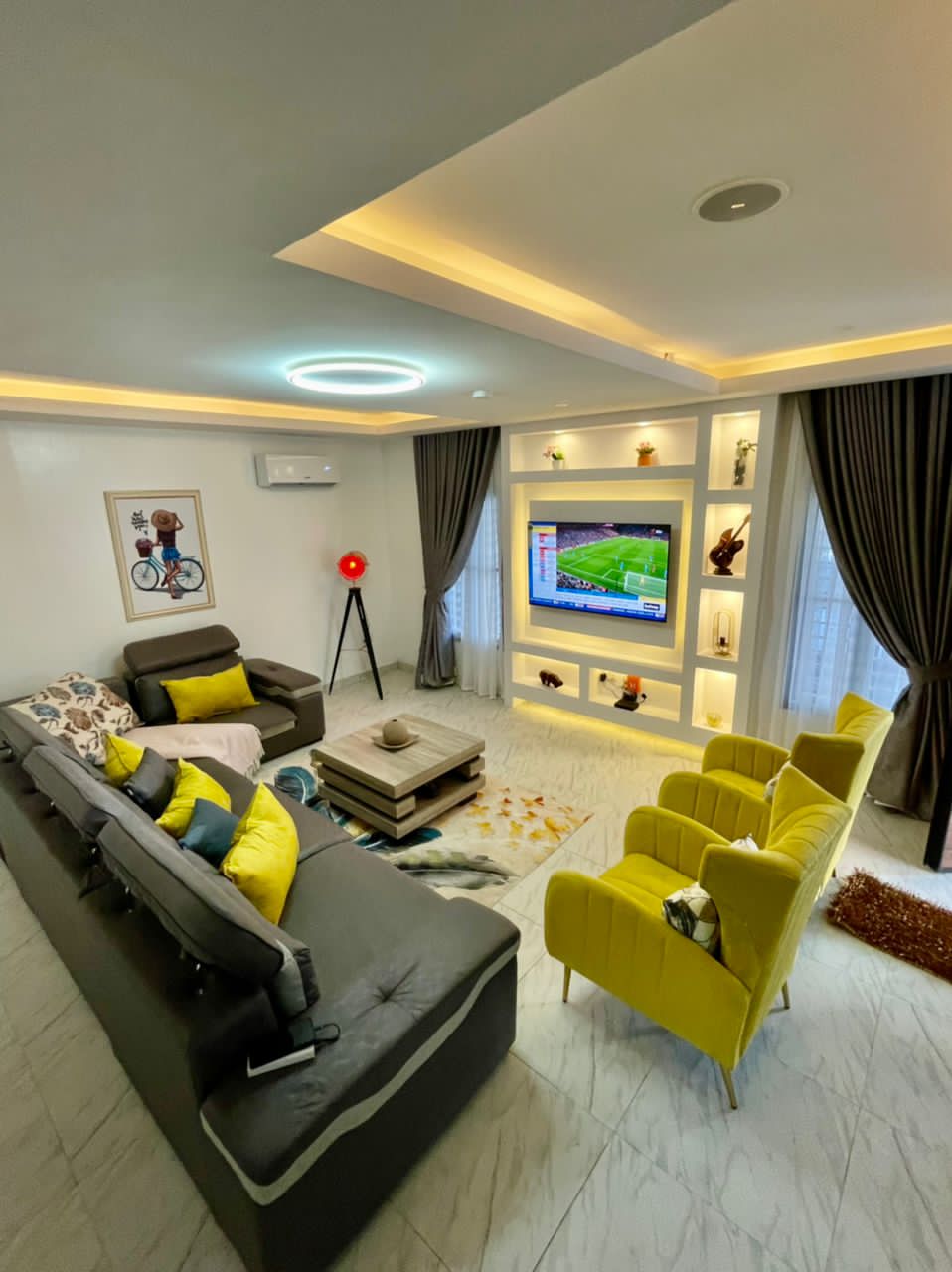Kick back and relax in this calm, stylish space. All rooms beautifully furnished with a 43" smart TVs in the master bedroom Ensuite bedrooms 65" Smart TV in the living room which is well decorated for your pleasure 24 hours power supply Unlimited free WIFI A snooker Lounge upstairs with a 43" Smart TV Terrace View from Snooker Lounge for your viewing pleasure Surround Bluetooth Speakers in the Living room ceiling (POP) Gym in the estate, Private beaches are 5 mins drive away.