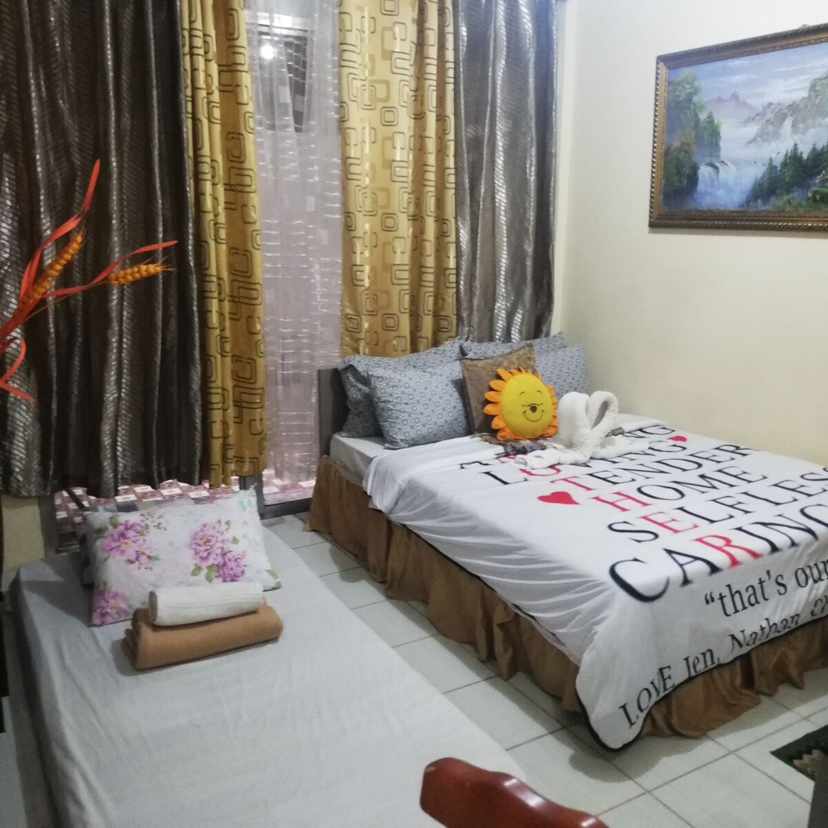 Din il-kamra tista 'takkomoda 2 persuni bil-kumdità biż-żewġ sodod singoli tagħha. Il-kumditajiet tagħha jinkludu l-Wi-Fi, ix-xugaman, ix-xampù u s-sapun u l-użu b 'xejn ta' Fitness Gym (fuq talba). Din il-kamra privata f 'bini, 15-il minuta biss' il bogħod mill-Ajruport permezz ta 'Skyway u qrib Ayala Malls u Museum. Huwa biss quddiem is-Santwarju Nazzjonali tal-Knisja tal-Qalb ta 'Sqadd u hemm ħafna postijiet fil-qrib fejn tiekol u tixtri. Huwa aċċessibbli permezz ta 'toroq ewlenin; Chino Roces u Ayala Avenue.