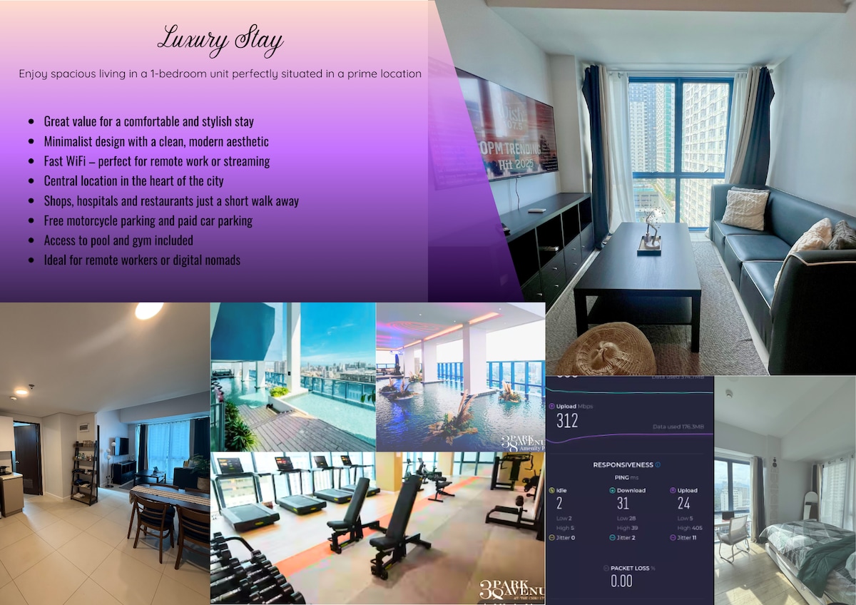 Gawdi għajxien kosmopolitan ta' kwalità għolja fi 38 Park Avenue fiċ-ċentru ta' Cebu IT Park. Duq il-kumditajiet bħal sodda doppja queen, Netflix u Wi-Fi tal-fibra b' veloċità għolja ta' 100Mbps. Duq il-pixxina mill-isbaħ Infinity, oqgħod f' kundizzjoni tajba fil-Gym u ħu ħsieb l-atmosfera tal-belt ta' Cebu. Dan il-condo modern għandu intern komdu u eleganti, diversi spazji tal-għajxien komunali u servizz ta' concierge għal checkin perfett. Mixja lejn ċentru kummerċjali Ayala u park tal-IT. Esperjenza l-aqwa għajxien fil-belt – ibbukkja ż-żjara tiegħek issa!